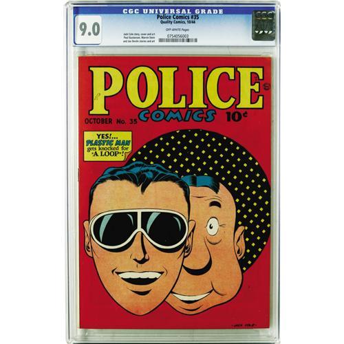 <B>Police Comics #35 (Quality, 1944) CGC VF/NM 9.0 Off-white pages.</B></I> Jack Cole's Plastic Man and Will Eisner's the Spirit star in this issue. The cover is credited to Cole. Overstreet 2006 VF/NM 9.0 value = $515; NM- 9.2 value = $700. CGC census 2/06: 3 in 9.0, 1 higher. <I>From the Collection of Harold Curtis.</B></I>