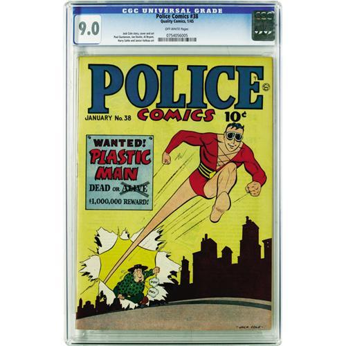 <B>Police Comics #38 (Quality, 1944) CGC VF/NM 9.0 Off-white pages.</B></I> We're proud to present yet another <B>Police</B></I> issue that hasn't been surpassed in CGC's census! Jack Cole's Plastic Man is the featured star as ever, with the Spirit also appearing. Overstreet 2006 VF/NM 9.0 value = $515; NM- 9.2 value = $700. CGC census 2/06: 3 in 9.0, none higher. <I>From the Collection of Harold Curtis.</B></I>
