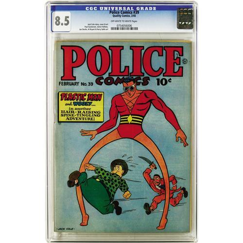 <B>Police Comics #39 (Quality, 1945) CGC VF+ 8.5 Off-white to white pages.</B></I> The zany style of Jack Cole is evident on this issue's cover, and of course Cole drew Plas' adventures inside the book as well. The Spirit also appears. Overstreet 2006 VF 8.0 value = $329; VF/NM 9.0 value = $515. CGC census 2/06: 1 in 8.5, 1 higher. <I>From the Collection of Harold Curtis.</B></I>