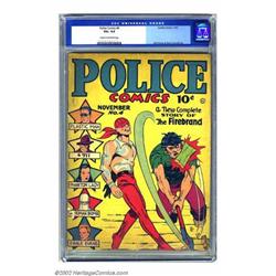 Police Comics #4 (Quality, 1941) CGC VG+ 4.5 Cream to off-white pages. The dashing character, the Firebrand by Gill Fox, gets another cover gig before relinquishing the perk to Plastic Man, who would hog the spotlight for the next 98 issues. As usual with this title, great artwork is provided by such stalwarts as Will Eisner, Reed Crandall, Jack Cole, Paul Gustavson, Al Bryant, Fred Guardineer, and Arthur Peddy. Overstreet 2002 GD 2.0 value = $191; FN 6.0 value = $573. Important notice: We expect to be auctioning lots at the rate of 200-250 per hour. Sometimes eBay Premier live bid software cannot keep up with that pace, so we strongly recommend that you place a realistic proxy bid now as insurance to avoid disappointment. Also please note that all Heritage/CAA lots purchased through eBay Premier carry a 20% Buyer's Premium. Please make sure you read the Terms and Conditions.