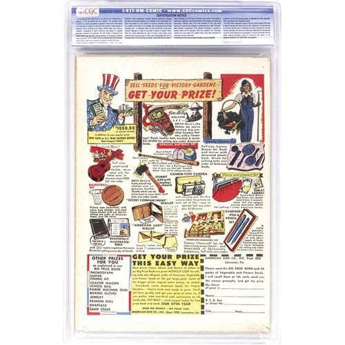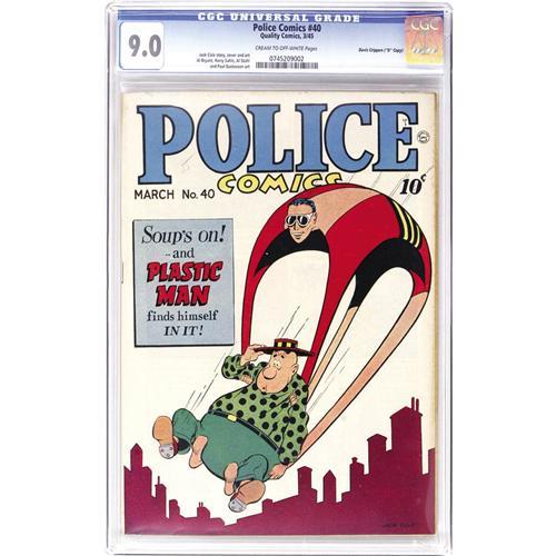 <B>Police Comics #40 Davis Crippen ("D" Copy) pedigree (Quality, 1945) CGC VF/NM 9.0 Cream to off-white pages.</B></I> The highest-graded copy of this white cover issue, this one has cover art by Jack Cole, who also drew the Plastic Man tale inside. The issue also has the Spirit by Will Eisner. Overstreet 2006 VF/NM 9.0 value = $515; NM- 9.2 value = $700. CGC census 6/06: 1 in 9.0, none higher. <I>From the Crippen Collection.</B></I> <BR><BR><B>Important notice:</B> Heritage usually auctions material at the rate of 200-250 lots per hour. On some occasions eBay Live bid software or the Internet may not be able to keep up with the pace of the auction. We recommend placing a realistic absentee bid now as insurance to avoid disappointment. Occasionally the auctioneer may eliminate or reject an eBay Live bid, and the auctioneer may also reopen a lot after the close of the eBay live bidding (usually because we missed an audience bid), and may reject your bid even if it shows you as the winning bidder. By bidding via eBay Live, you agree that Heritage may award the lot to another bidder at its sole discretion under the circumstances described above or any other reasonable circumstances. Since eBay bids are not shown to us until we open the lot on the floor, we treat those bids just like floor bids. In most cases the floor responds before the eBay bid is presented to us, due to Internet lag time, so for consistency we have made it a policy that floor bids are always considered first over tie eBay live bids. Also please note that all Heritage lots purchased through eBay Live carry a 22.5% Buyer's Premium. Please make sure you read the Terms and Conditions before you bid. This lot is being auctioned in conjunction with a live floor auction by Heritage Auction Galleries. All final auction and invoice information will be supplied by Heritage Auction Galleries, and all other information should be considered preliminary. Lot:41001 <BR><BR><B>Winning Notification and Billing:</B> After the FINAL session in this auction is complete, Heritage will send e-mail and snail mail invoices. This process normally takes several days. All final auction and invoice information will be supplied by Heritage Auction Galleries, and all other information should be considered preliminary. <BR><BR>This auction will be conducted on a live auction floor and over the Internet through eBay Live. If you choose to place an absentee bid, please take a moment to <font color='#0000ff'><u><a href='http://pages.ebay.com/liveauctions/help/before/laabsentee.html'>learn how eBay Live absentee bidding works</a></u></font><font color='#000000'>