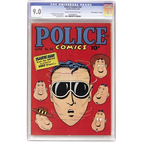 <B>Police Comics #43 Davis Crippen ("D" Copy) pedigree (Quality, 1945) CGC VF/NM 9.0 Cream to off-white pages.</B></I> Plastic Man story, cover, and art by Jack Cole, and Spirit back-up story by Will Eisner and Lou Fine. This is the highest graded copy of this issue certified by CGC to date. Overstreet 2006 VF/NM 9.0 value = $507; NM- 9.2 value = $690. CGC census 7/06: 1 in 9.0, none higher. <I>From the Crippen Collection.</B></I> <BR><BR><B>Important notice:</B> Heritage usually auctions material at the rate of 200-250 lots per hour. On some occasions eBay Live bid software or the Internet may not be able to keep up with the pace of the auction. We recommend placing a realistic absentee bid now as insurance to avoid disappointment. Occasionally the auctioneer may eliminate or reject an eBay Live bid, and the auctioneer may also reopen a lot after the close of the eBay live bidding (usually because we missed an audience bid), and may reject your bid even if it shows you as the winning bidder. By bidding via eBay Live, you agree that Heritage may award the lot to another bidder at its sole discretion under the circumstances described above or any other reasonable circumstances. Since eBay bids are not shown to us until we open the lot on the floor, we treat those bids just like floor bids. In most cases the floor responds before the eBay bid is presented to us, due to Internet lag time, so for consistency we have made it a policy that floor bids are always considered first over tie eBay live bids. Also please note that all Heritage lots purchased through eBay Live carry a 22.5% Buyer's Premium. Please make sure you read the Terms and Conditions before you bid. This lot is being auctioned in conjunction with a live floor auction by Heritage Auction Galleries. All final auction and invoice information will be supplied by Heritage Auction Galleries, and all other information should be considered preliminary. Lot:41001 <BR><BR><B>Winning Notification and Billing:</B> After the FINAL session in this auction is complete, Heritage will send e-mail and snail mail invoices. This process normally takes several days. All final auction and invoice information will be supplied by Heritage Auction Galleries, and all other information should be considered preliminary. <BR><BR>This auction will be conducted on a live auction floor and over the Internet through eBay Live. If you choose to place an absentee bid, please take a moment to <font color='#0000ff'><u><a href='http://pages.ebay.com/liveauctions/help/before/laabsentee.html'>learn how eBay Live absentee bidding works</a></u></font><font color='#000000'>