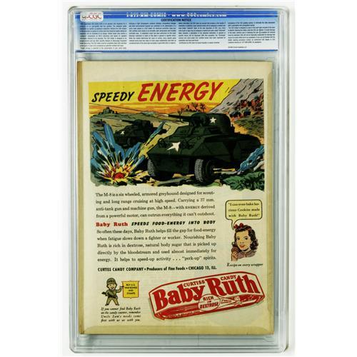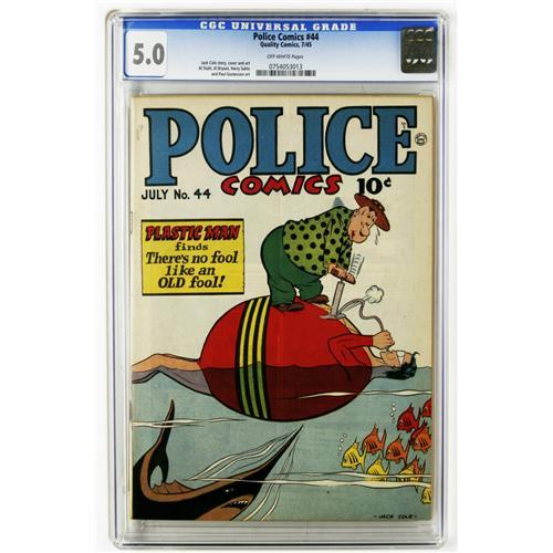 <B>Police Comics #44 (Quality, 1945) CGC VG/FN 5.0 Off-white pages.</B></I> Jack Cole cover. Plastic Man by Cole. The Spirit by Will Eisner and Lou Fine. Note that a small plastic stabilizing peg is loose inside the CGC holder, not affecting the comic itself or the integrity of the holder. Overstreet 2006 VG 4.0 value = $106; FN 6.0 value = $159. CGC census 3/06: 2 in 5.0, 3 higher. <I>From the Collection of Harold Curtis.</B></I>