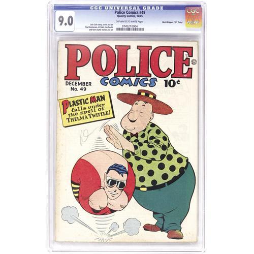 <B>Police Comics #49 Davis Crippen ("D" Copy) pedigree (Quality, 1945) CGC VF/NM 9.0 Off-white to white pages.</B></I> This stands as the only copy graded above 7.5 by CGC as of this writing. Jack Cole is credited with the cover as well as the Plastic Man interior art. The Spirit, the Human Bomb, and Manhunter appear in backup features. Overstreet 2006 VF/NM 9.0 value = $382; NM- 9.2 value = $520. CGC census 6/06: 1 in 9.0, none higher. <I>From the Crippen Collection.</B></I> <BR><BR><B>Important notice:</B> Heritage usually auctions material at the rate of 200-250 lots per hour. On some occasions eBay Live bid software or the Internet may not be able to keep up with the pace of the auction. We recommend placing a realistic absentee bid now as insurance to avoid disappointment. Occasionally the auctioneer may eliminate or reject an eBay Live bid, and the auctioneer may also reopen a lot after the close of the eBay live bidding (usually because we missed an audience bid), and may reject your bid even if it shows you as the winning bidder. By bidding via eBay Live, you agree that Heritage may award the lot to another bidder at its sole discretion under the circumstances described above or any other reasonable circumstances. Since eBay bids are not shown to us until we open the lot on the floor, we treat those bids just like floor bids. In most cases the floor responds before the eBay bid is presented to us, due to Internet lag time, so for consistency we have made it a policy that floor bids are always considered first over tie eBay live bids. Also please note that all Heritage lots purchased through eBay Live carry a 22.5% Buyer's Premium. Please make sure you read the Terms and Conditions before you bid. This lot is being auctioned in conjunction with a live floor auction by Heritage Auction Galleries. All final auction and invoice information will be supplied by Heritage Auction Galleries, and all other information should be considered preliminary. Lot:41001 <BR><BR><B>Winning Notification and Billing:</B> After the FINAL session in this auction is complete, Heritage will send e-mail and snail mail invoices. This process normally takes several days. All final auction and invoice information will be supplied by Heritage Auction Galleries, and all other information should be considered preliminary. <BR><BR>This auction will be conducted on a live auction floor and over the Internet through eBay Live. If you choose to place an absentee bid, please take a moment to <font color='#0000ff'><u><a href='http://pages.ebay.com/liveauctions/help/before/laabsentee.html'>learn how eBay Live absentee bidding works</a></u></font><font color='#000000'>