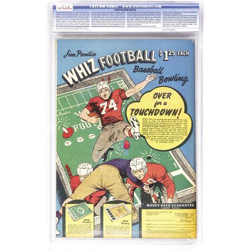 48C. COMICS – Comic books sold referencing a third-party grading service are sold "as is" without any express or implied warranty. Certain warranties may be available from the grading services and the Bidder is referred to them for further details: Comics Guaranty Corporation (CGC), P.O. Box 4738, Sarasota, FL 34230. Subject to sections 57 and 58, bidders who intend to challenge authenticity or provenance of a lot must notify Auctioneer in writing within thirty (30) days of the Auction's conclusion. Auctioneer's maximum liability shall not exceed the high bid on that lot, which bid shall be deemed for all purposes the value of the lot. In the event Auctioneer cannot deliver the lot or subsequently it is established that the lot lacks title, provenance, authenticity, or other transfer or condition issue is claimed, Auctioneer's liability shall be limited to recission of sale and refund of purchase price. After one year has elapsed, Auctioneer's maximum liability shall be limited to any commissions and fees Auctioneer earned on that lot.