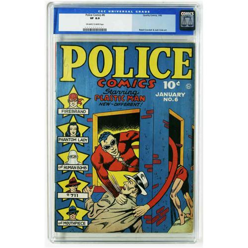 <B>Police Comics #6 (Quality, 1942) CGC VF 8.0 Off-white to white pages.</B></I> This is just the second cover appearance for Plastic Man, and so early in his crimefighting career that he still wasn't the lead feature -- that honor went to Firebrand, who was expertly drawn by Reed Crandall. Also in this issue's cast are the Human Bomb and the early (fully-dressed) incarnation of Phantom Lady. Overstreet 2005 VF 8.0 value = $1,031. CGC census 12/05: 3 in 8.0, 1 higher.