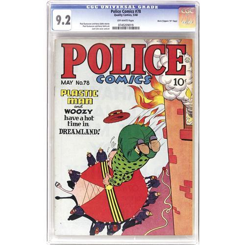 <B>Police Comics #78 Davis Crippen ("D" Copy) pedigree (Quality, 1948) CGC NM- 9.2 Off-white pages.</B></I> Jack Cole's Plastic Man is the star here, or perhaps we should say this copy's condition is what stands out - no copy has been graded higher to date! Overstreet 2006 NM- 9.2 value = $300. CGC census 6/06: 1 in 9.2, none higher. <I>From the Crippen Collection.</B></I> <BR><BR><B>Important notice:</B> Heritage usually auctions material at the rate of 200-250 lots per hour. On some occasions eBay Live bid software or the Internet may not be able to keep up with the pace of the auction. We recommend placing a realistic absentee bid now as insurance to avoid disappointment. Occasionally the auctioneer may eliminate or reject an eBay Live bid, and the auctioneer may also reopen a lot after the close of the eBay live bidding (usually because we missed an audience bid), and may reject your bid even if it shows you as the winning bidder. By bidding via eBay Live, you agree that Heritage may award the lot to another bidder at its sole discretion under the circumstances described above or any other reasonable circumstances. Since eBay bids are not shown to us until we open the lot on the floor, we treat those bids just like floor bids. In most cases the floor responds before the eBay bid is presented to us, due to Internet lag time, so for consistency we have made it a policy that floor bids are always considered first over tie eBay live bids. Also please note that all Heritage lots purchased through eBay Live carry a 22.5% Buyer's Premium. Please make sure you read the Terms and Conditions before you bid. This lot is being auctioned in conjunction with a live floor auction by Heritage Auction Galleries. All final auction and invoice information will be supplied by Heritage Auction Galleries, and all other information should be considered preliminary. Lot:41001 <BR><BR><B>Winning Notification and Billing:</B> After the FINAL session in this auction is complete, Heritage will send e-mail and snail mail invoices. This process normally takes several days. All final auction and invoice information will be supplied by Heritage Auction Galleries, and all other information should be considered preliminary. <BR><BR>This auction will be conducted on a live auction floor and over the Internet through eBay Live. If you choose to place an absentee bid, please take a moment to <font color='#0000ff'><u><a href='http://pages.ebay.com/liveauctions/help/before/laabsentee.html'>learn how eBay Live absentee bidding works</a></u></font><font color='#000000'>