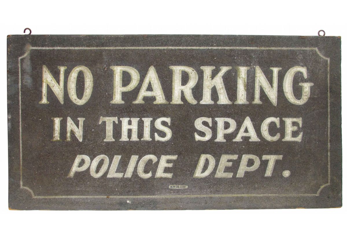 Police Department No Parking Outdoor Wood Sand Sign, two sided. Very good original condition. 18 X 9 1/2 inches.
