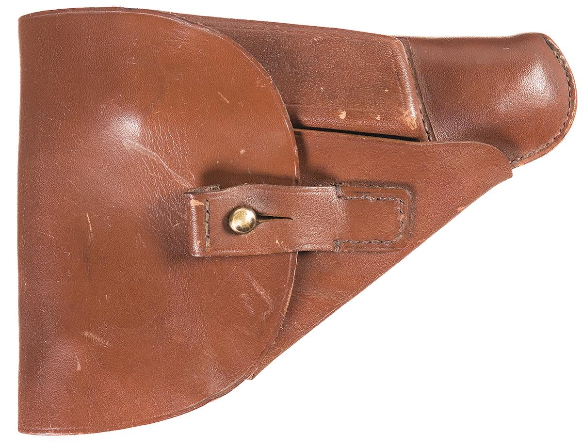 Condition: Refinished. The pistol retains most of the blue finish with a faint plum patina on the frame which has limited pin point pitting. The grips are slightly wrapped at the top, otherwise the grips are fine with a few hairline cracks and a few minor nicks. The holster is very good plus with some minor flex wear and handling marks. The stitching is tight.