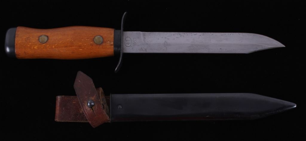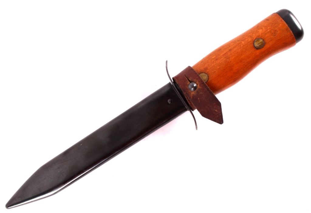 This is a Polish Dagger Fighting Knife from an Airborne Paratrooper. This Post WWII piece shows a wood handle and the original scabbard. Marked 11 (in an oval) 1957 Serial number Z08582.