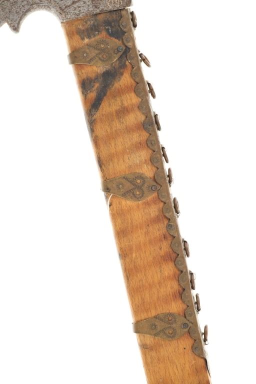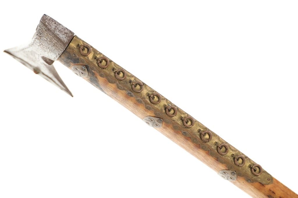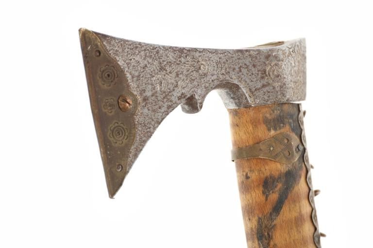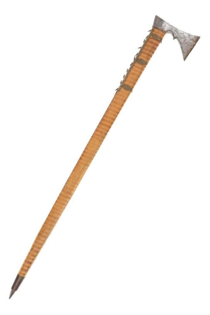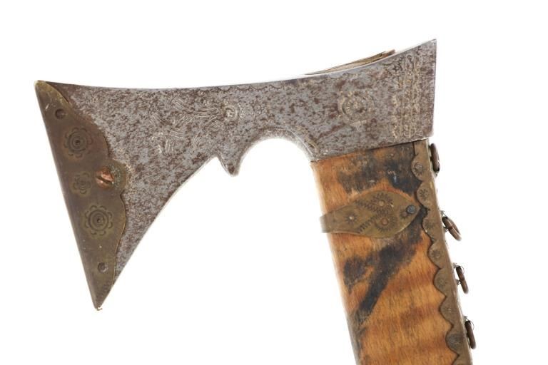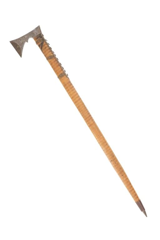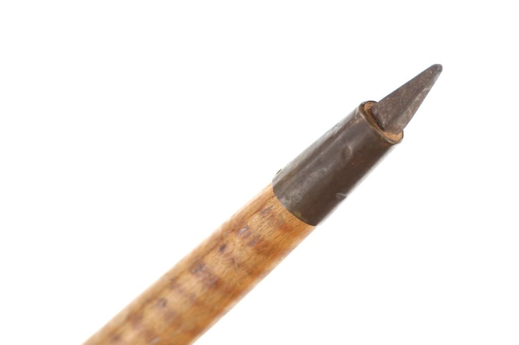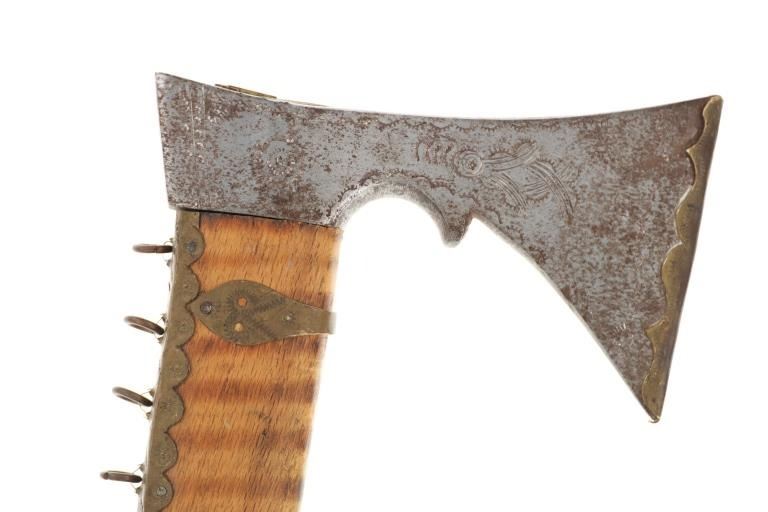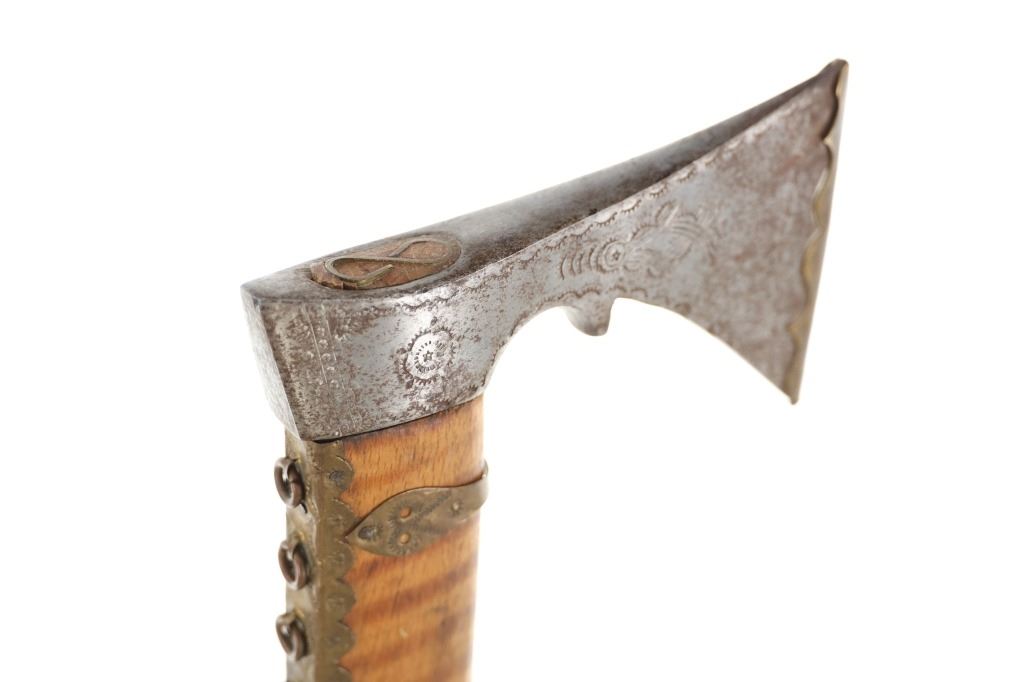 For your consieration is an Original Polish Ciupaga Shepherd's Axe/Walking Stick, circa early to mid 20th century. The ciupaga is the Polish mountaineer's combination mountain axe and walking stick. The shepherd's axe is a long thin light axe of Eurasian origin used in past centuries by shepherds in the Carpathian Mountains and in other territories which comprise today Slovakia, Czech Republic, Poland, Ukraine, Romania and Hungary. The features of a shepherd's axe combine a tool with a walking stick, that could be used as a light weapon. It has symbolic historical and cultural connotations and is still used as a prop in many traditional dances. Today's shepherd's axes are mostly decorative with mostly brass, iron, chromed iron, wood, or aluminum head-pieces. Many are considered works of art (esp. those made up to the 1960s by Polish highlanders). They were skillfully stamped/adorned according to ancient tradition. The main motifs were the sun, stars (whirl), comets, tree of life, flowers, trees such as fir or spruce, and various geometric designs. Some smiths used many different, elaborated stamps. This shepherd's axe has a chromed iron head with brass fittings and copper rings, the head is stamped with sun and star motifs. The tapered wood shaft has a horizontal stripe pattern in the wood grain, and a hardened metal tip. Shepherd's axe is in nice condition, fading observed to stamping from age and use, no other marring noted. Measures 33.25"L x 1.5"W x .75"D, head is 5.25"L x 3"W x .5"D, weight is 1lb, 6oz.
