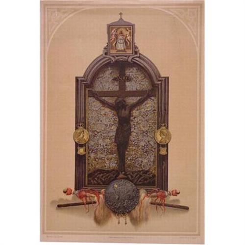 Color lithograph of Jesus Crucified. Text in Polish roughly translates as: "Color lithograph in remembrance of the anniversary Poland's defeat of the Turkish invasion." Royal medal on left side of the crucifix shows Poland's great 16th Century King Istvan Bathory who defeated the Turks and Czar Ivan the Terrible saving Poland and Central Europe from the Russian invasion.