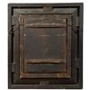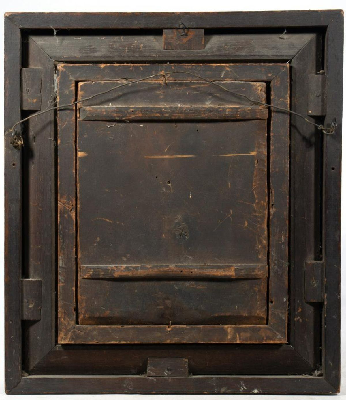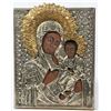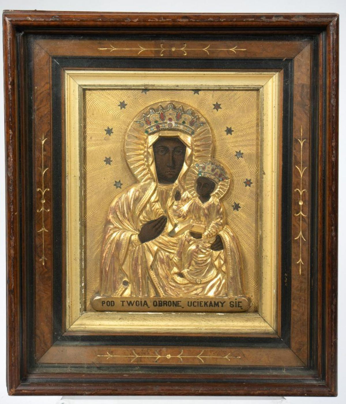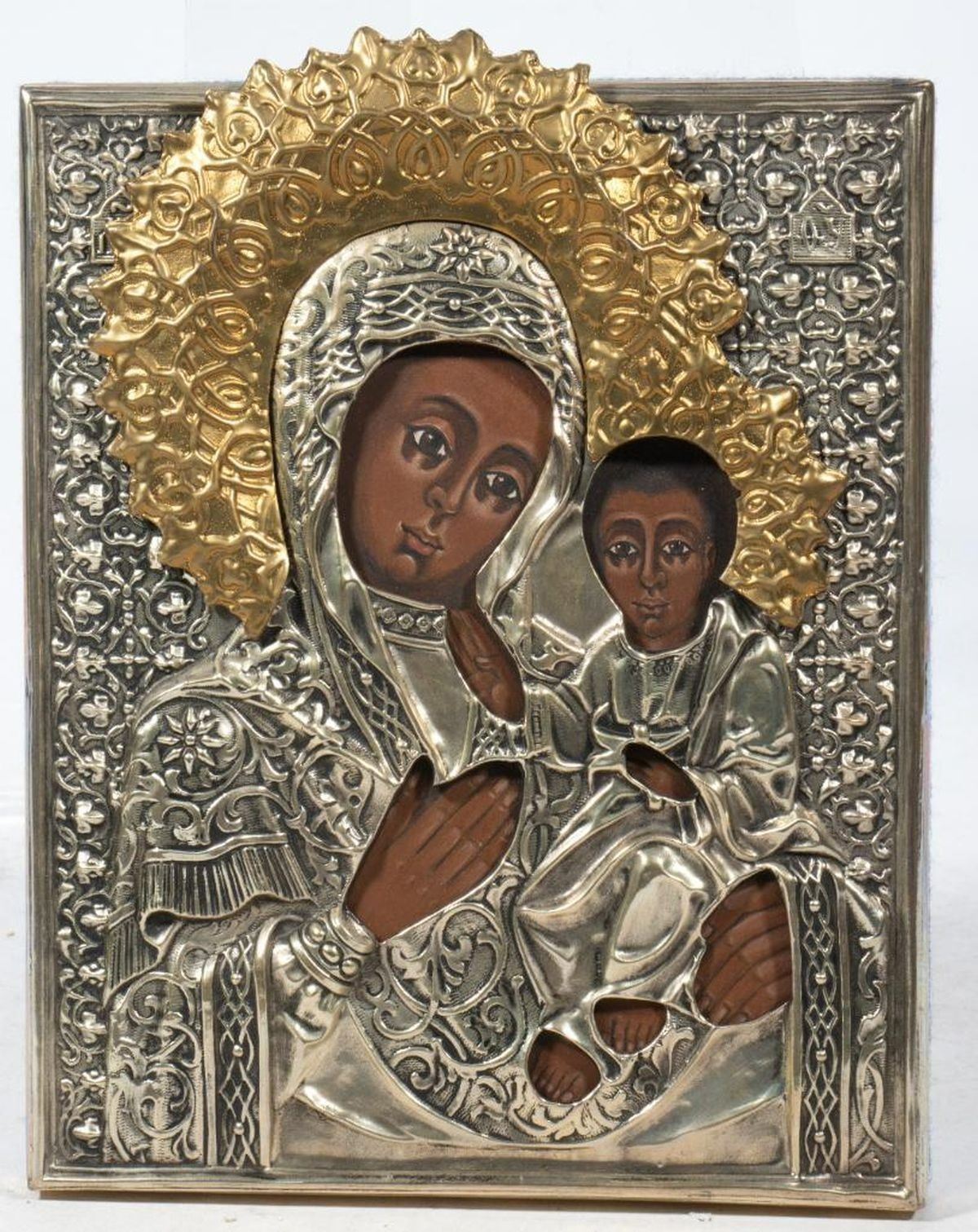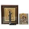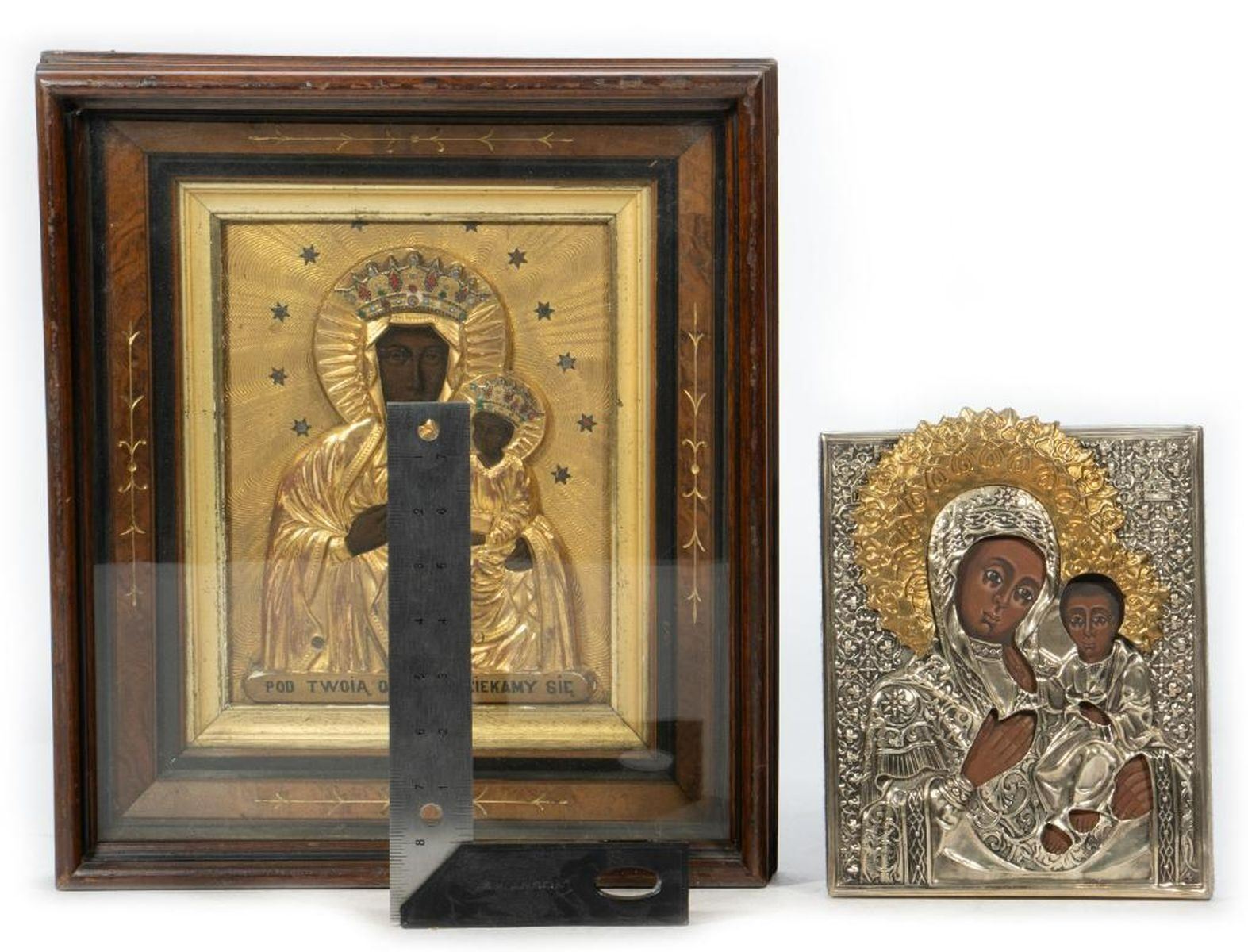 The gilt-painted icon mounted on a giltwood panel with "jeweled" embellishments, set in a deep frame with gilt borders; 10 1/4in. x 7 1/4in. (wood panel); 16in. x 14in. x 2 1/2in. (frame). Together with a smaller more contemporary silver and gold metal oklad painted Madonna and Child icon ( 3/4in. x 7 1/4in.). Condition: The framed icon with wear to gilt, some missing "jewels"; a screw that attaches the icon relief to the wood panel is showing at the center of the crown, and another at lower left.