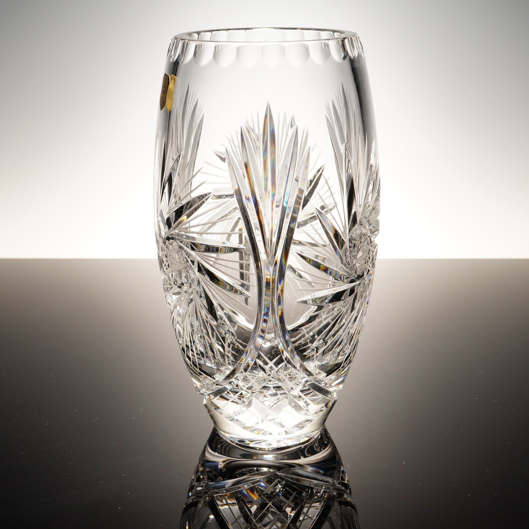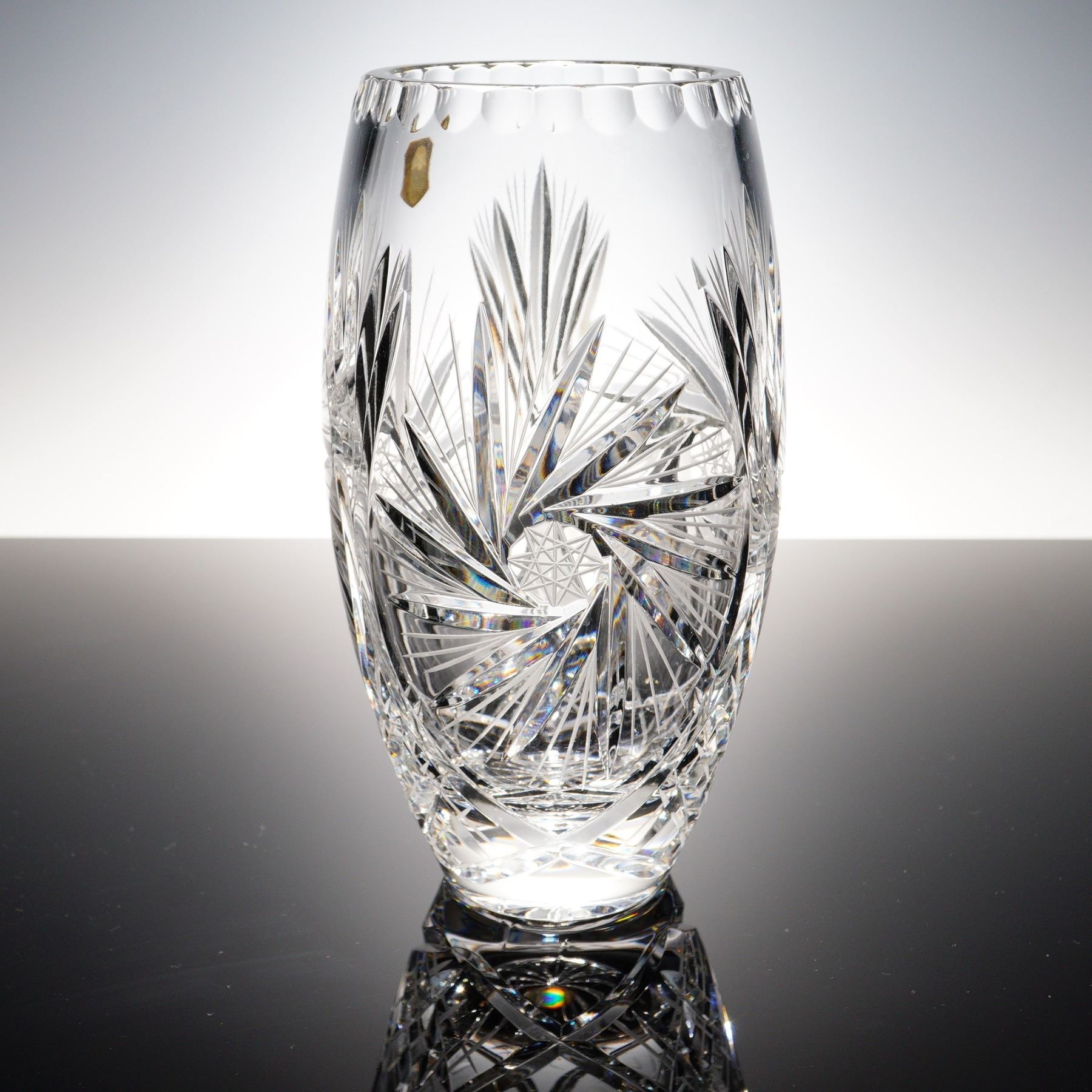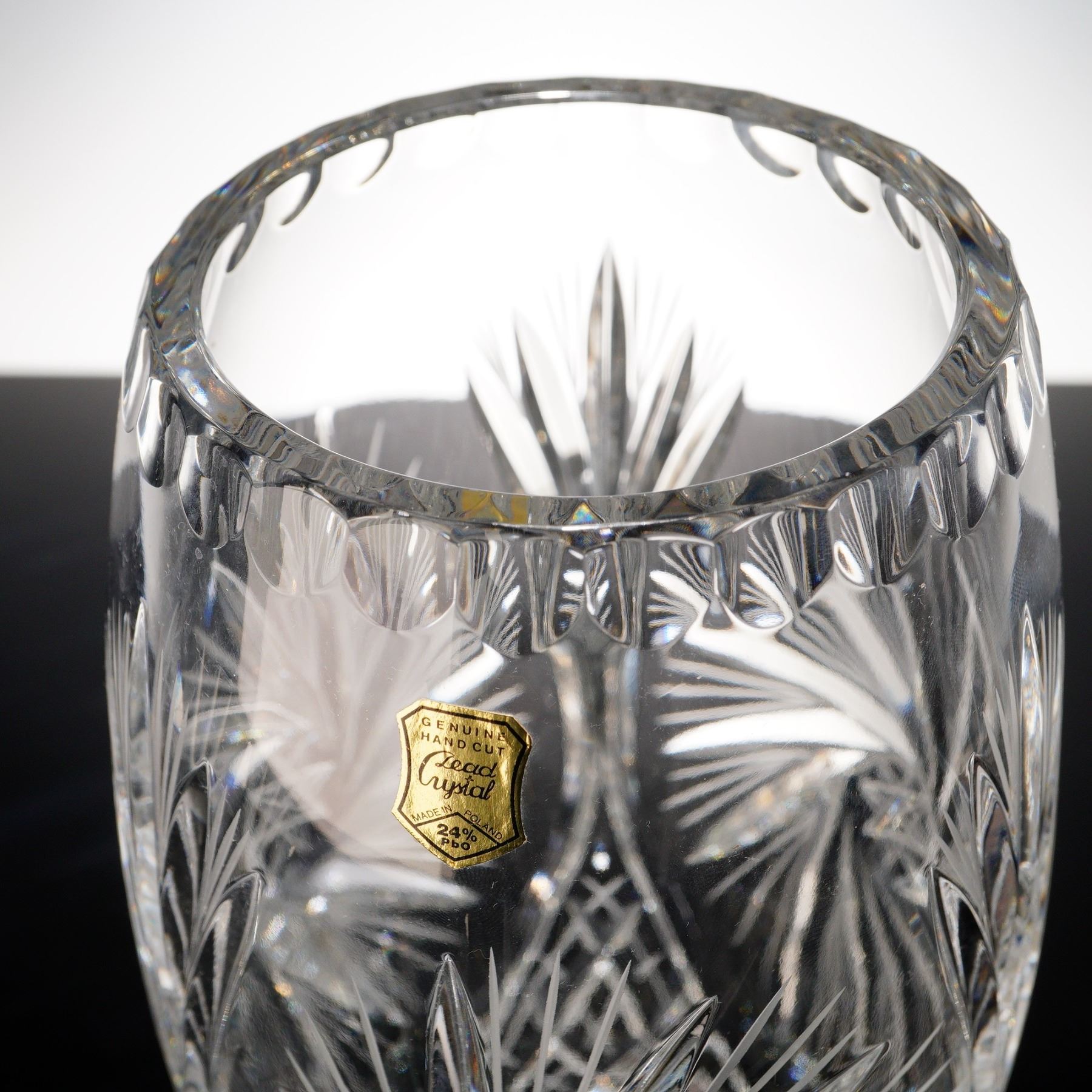 A brilliant hand cut lead crystal vase made in Poland, richly decorated with intersecting fan cuts, starbursts, and arched panels. The ovoid form is crafted from 24% lead crystal, as confirmed by the original foil label, and features a deeply scalloped rim and a twelve-point etched star medallion at center. Likely produced by Huta Julia or Violetta during the late 20th century, this piece exemplifies the clarity and craftsmanship associated with Polish crystal exports. In excellent condition with no chips or cracks.