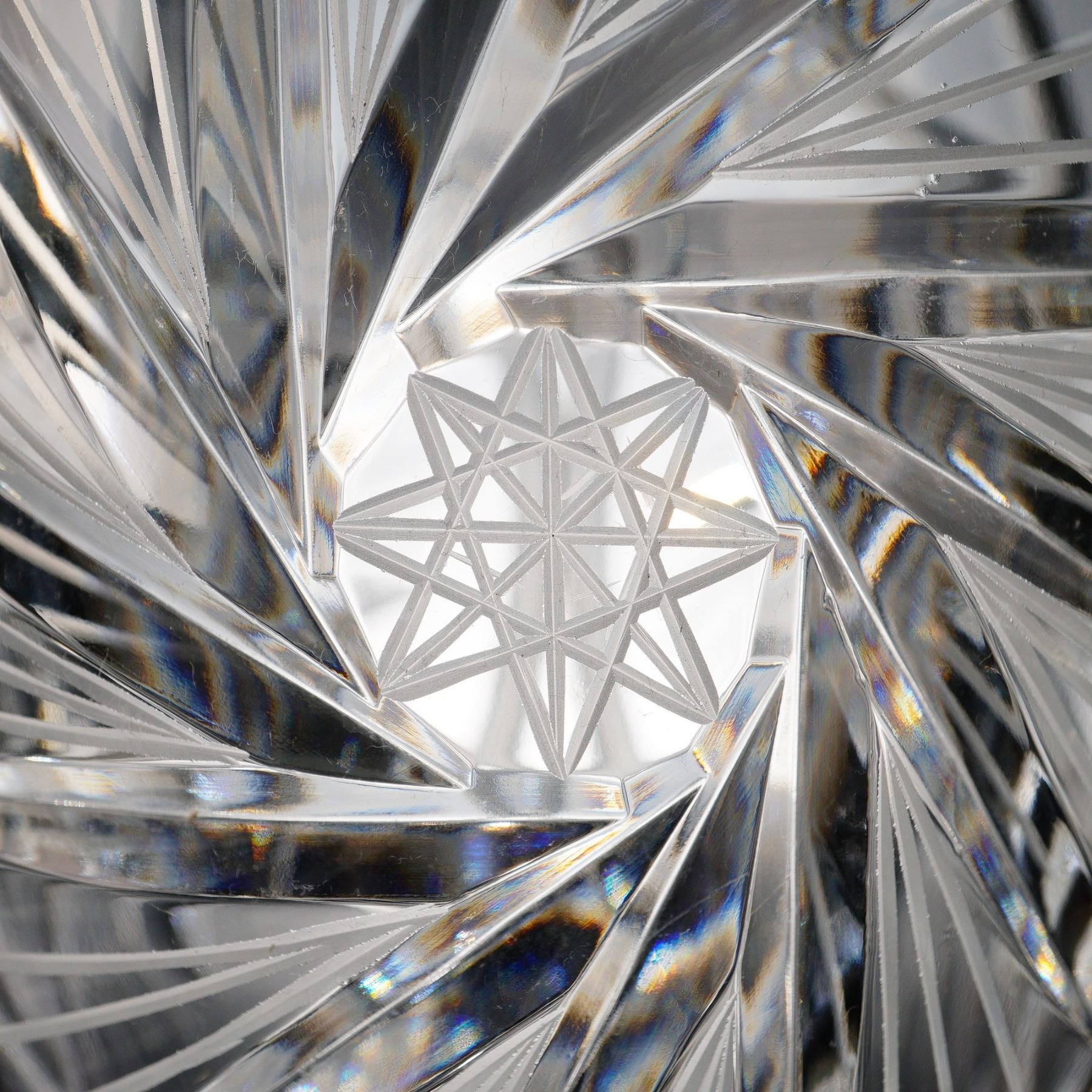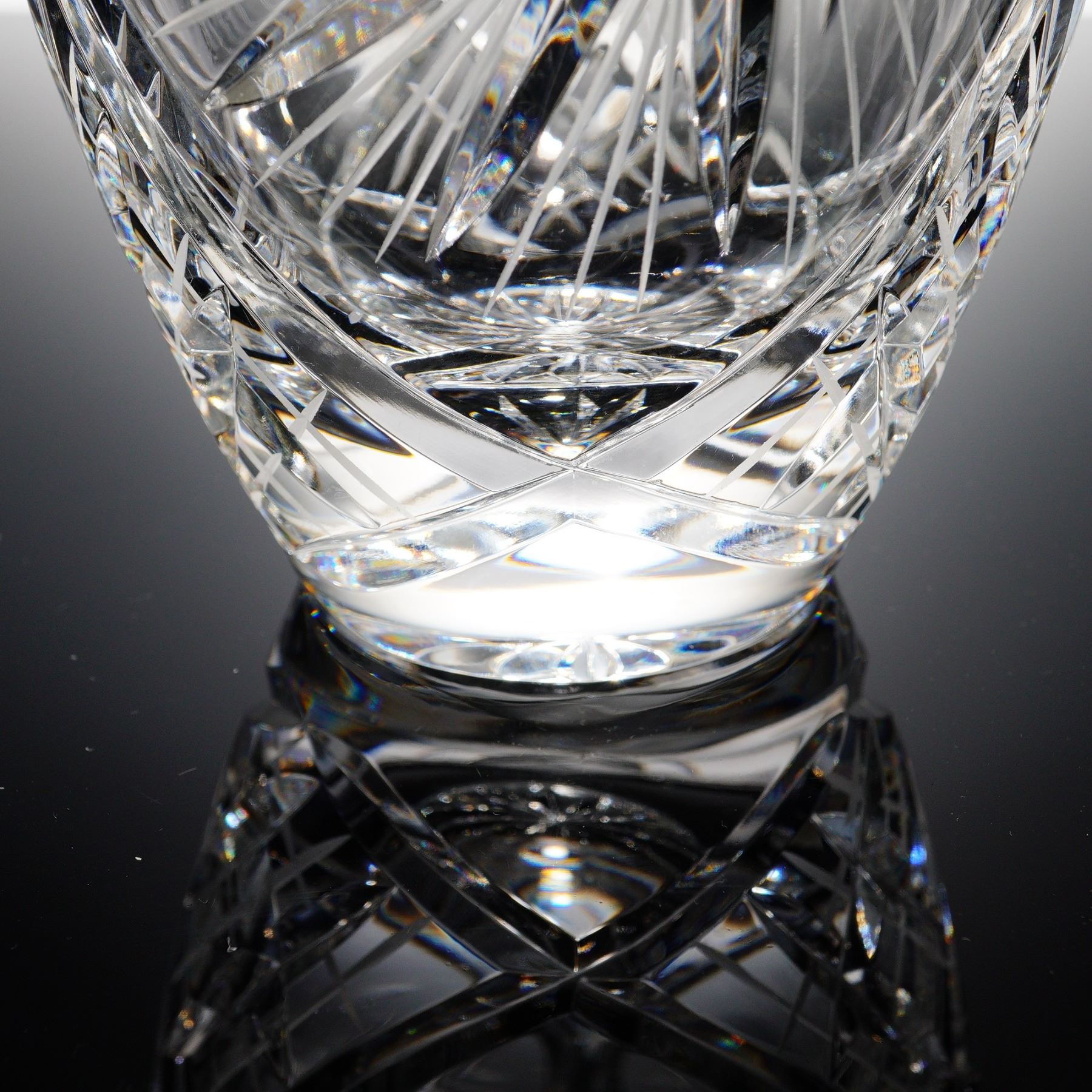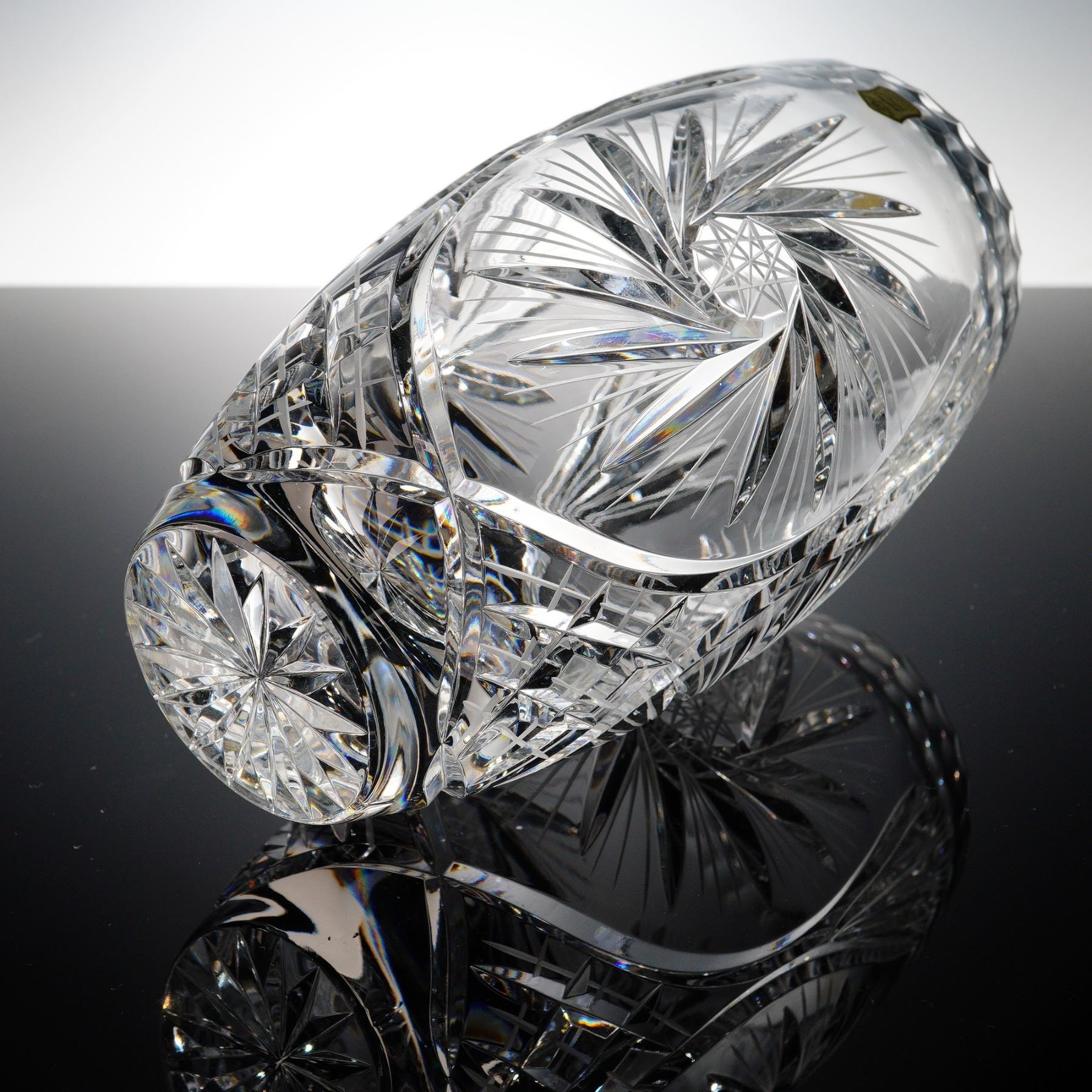 A brilliant hand cut lead crystal vase made in Poland, richly decorated with intersecting fan cuts, starbursts, and arched panels. The ovoid form is crafted from 24% lead crystal, as confirmed by the original foil label, and features a deeply scalloped rim and a twelve-point etched star medallion at center. Likely produced by Huta Julia or Violetta during the late 20th century, this piece exemplifies the clarity and craftsmanship associated with Polish crystal exports. In excellent condition with no chips or cracks.