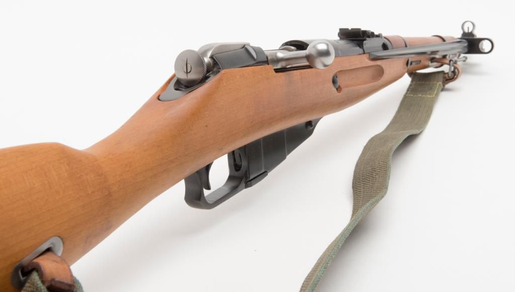 Polish Model 44 bolt action carbine with folding bayonet, 7.62x54R mm cal., 20-1/2” barrel, blued finish, wood stock with fabric sling, #RA6412 (made in 1955) in overall fine condition showing the majority of its finish, fine bore, action,markings and beautiful wood stock. (Modern). Est.: $200-$300.