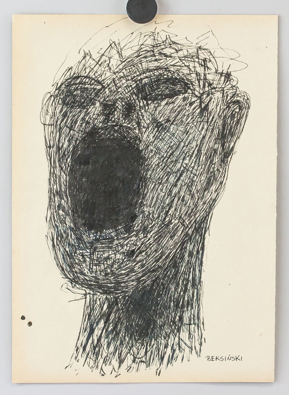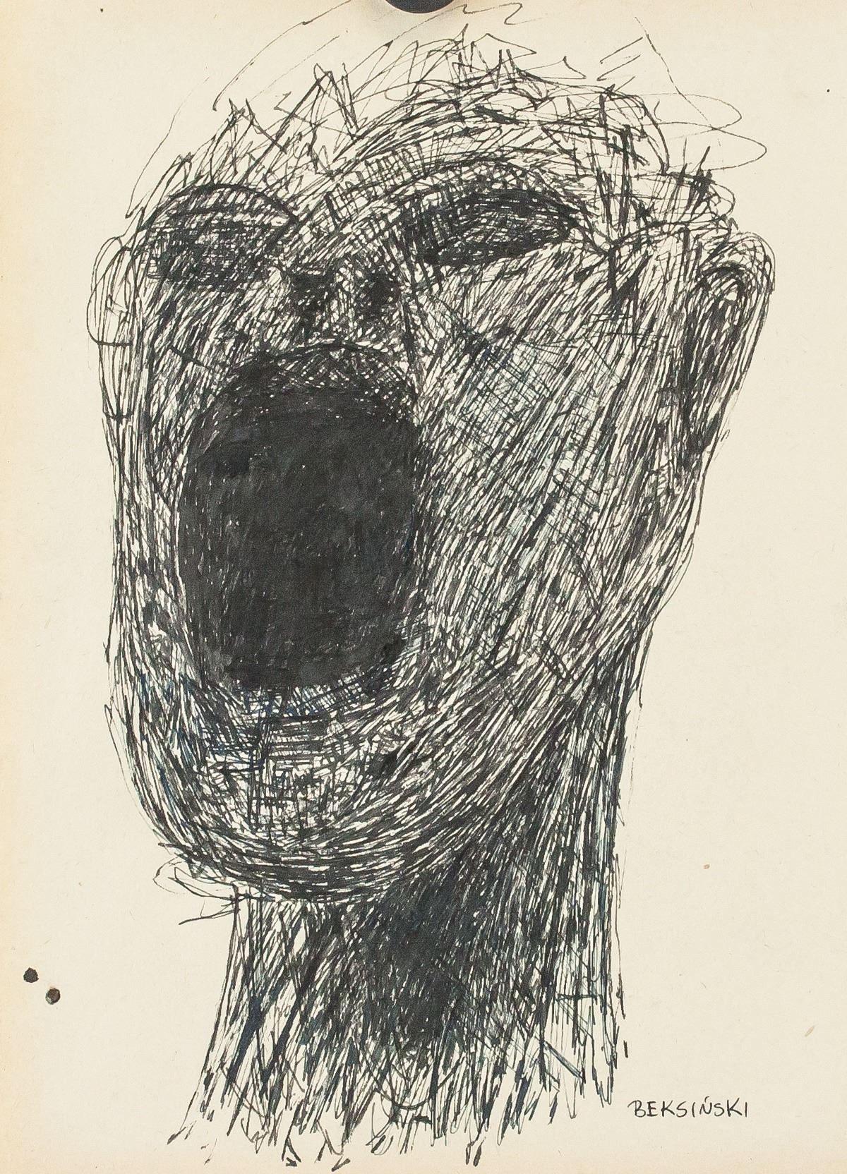 Ink on paper. Featuring a surrealist portrait of a screaming man. Signed illegibly on the lower right corner. 30 x 21 cm (11.75 x 8.25 inches). PROVENANCE: This lot carries limited provenance from a Southern Ontario estate