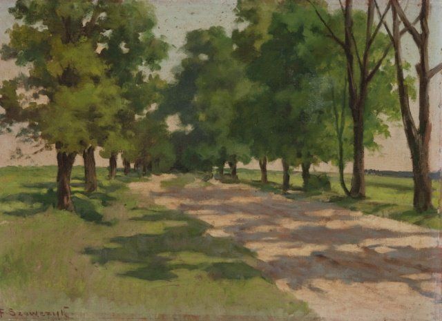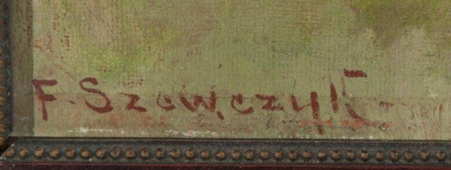 F. Szewczyk (Poland, 19th/20th century)/ Landscape with dirt path and trees. With Polish gallery label on reverse of frame. Oil on canvas. Signed at l.l., "F. Szewczyk". Wood frame. 10 3/4" x 15". Frame: 16" x 20".