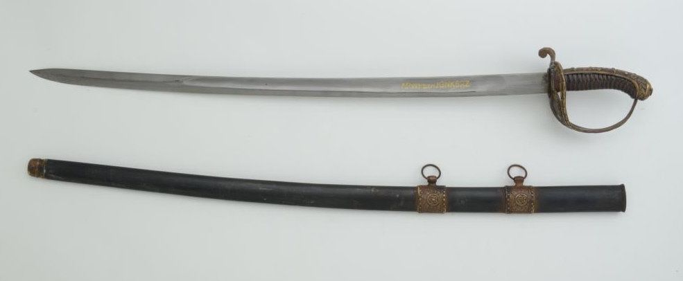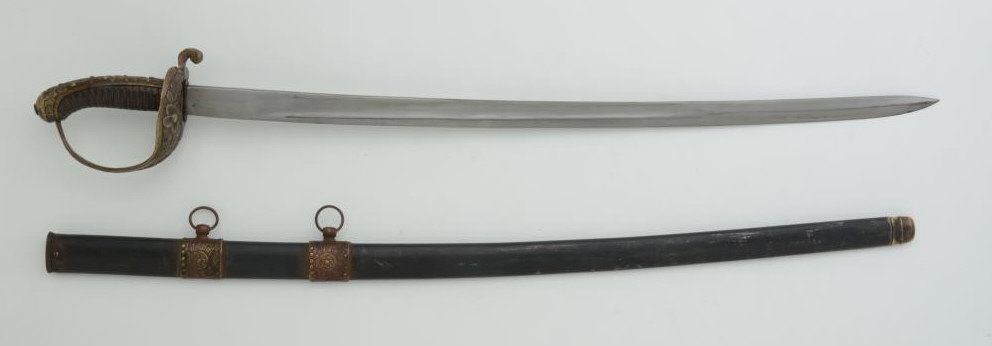 Polish style sword with metal scabbard, approx 34” overall with a 28-1/2” blade marked “APWFEDIJGNKSXZ” in overall good condition with cast floral guard and wire wrapped grip; scabbard has floral designhangers; age unknown. Est.: $100-$300.
