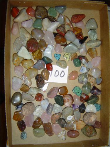 104 plus pieces of polished semi-precious stones, good quality, med to large size, some geodes, etc., approx. 2.5 lbs.
