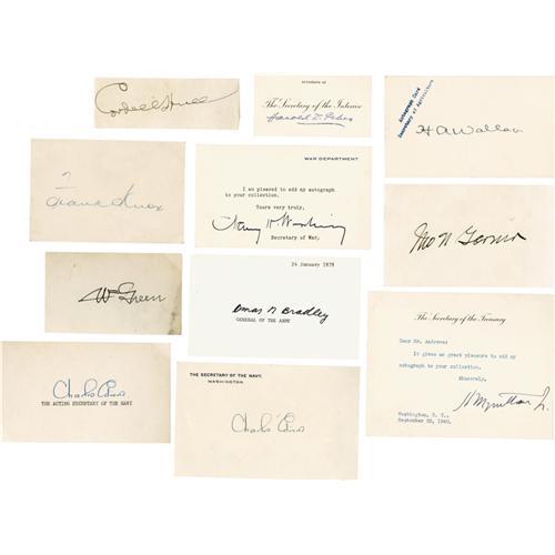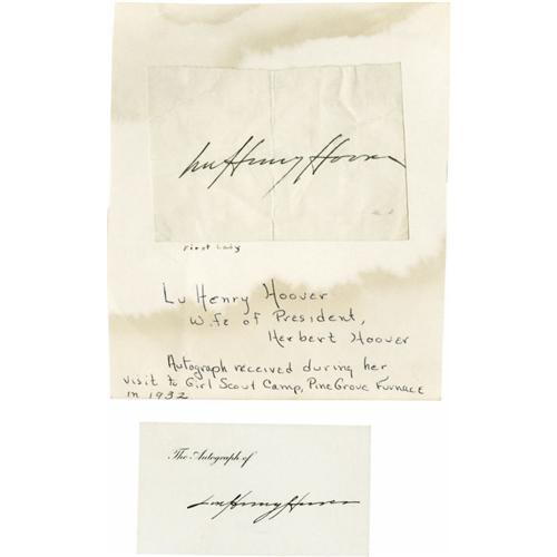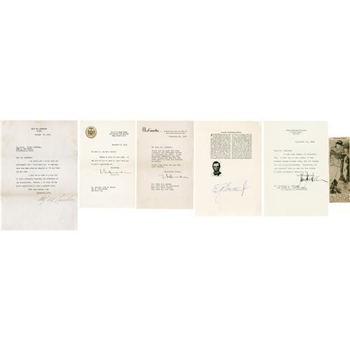 <B>Political Autograph Collection 1920s - 1940s</B></I> consisting of more than 20 signed items including the following: Eleanor Roosevelt (2 TLS); Lou Henry Hoover (2 Signatures); Henry A. Wallace (Signature); John Nance Garner (Signature); Henry Morgenthau, Jr (2 Signatures); Harold L. Ickes (Signature); Charles Edison (2 Signatures); Levi P. Morton (Signed Cabinet Card Photo); Frank Knox (Signature); Cordell Hull (Signature); Alf M. Landon (TLS); Fiorello LaGuardia (2 TLS). Generally very good to fine condition.