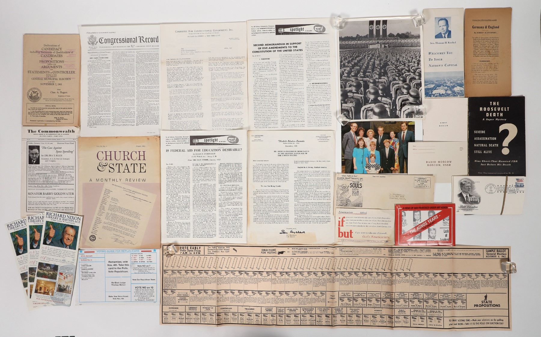 Pamphlets and brochures all dealing with politics in the United States. This includes a copy of a bill presented by California Senator S.I Hayakawa asking if English should be the designated language of the country (1982). There's also a 1965 edition of "Church & State." Plenty more where this came from. Please see photos for more details._x000D_