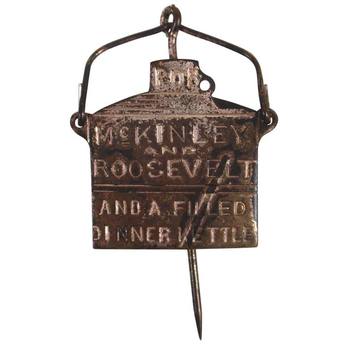 Political McKinley & Theodore Roosevelt items (4), McKinley & Roosevelt Prosperity Parade ribbon from Cleveland, Nov. 3, 1900 w/dinner bucket graphic, McKinley & Roosevelt sepia-tone 1.25" dinner bucket cello jugate w/orig backpaper, embossed metal dinner bucket stickpin & Sound Money ribbon, all in Exc cond, up to 7"L.