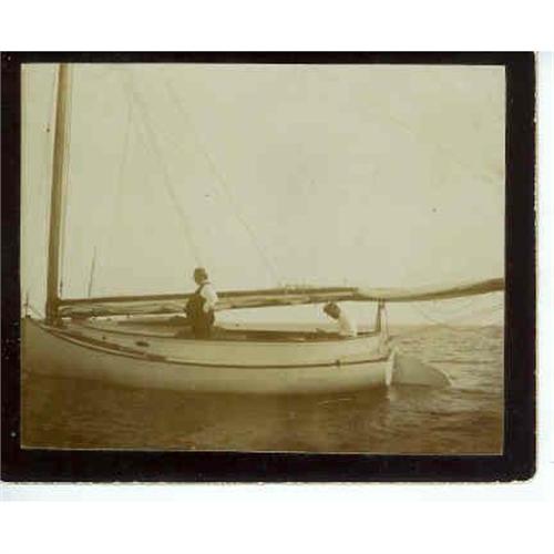 5.1/8" X 4.1/8" Sepia. Showing President Cleveland standing in a boat. On the back is written, "President Cleveland fishing in Buzzards Bay August 1875 Taken by Mr Wriship"