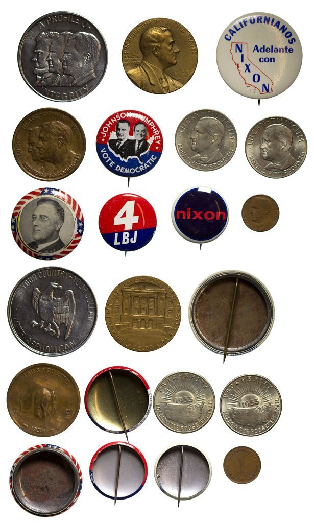1935-1965 Lot of 11 that includes tokens, button pins, etc. for Roosevelt, Johnson, Nixon, including Texas Centennial Roosevelt & Garner 1936, Nixon-Eisenhower & Lincoln Profiles, Johnson-Humphrey 1964 button, Nixon California button. Weber Collection