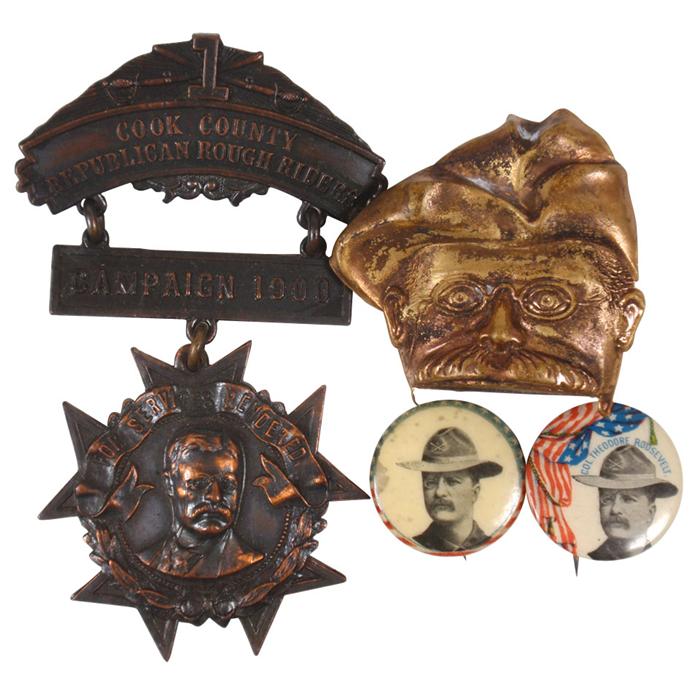 Political items (4), Cook Co. Republican Rough Riders1900 Campaign badge (presented by Wm. Boldenweck embossed back), Exc, 3.5"L, (2) Col. Theodore Roosevelt 7/8" cello buttons w/orig backpaper (one w/some foxing) & brass Roosevelt face pin (missing jaw).