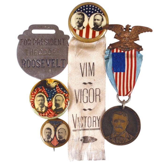 Political items (5), Roosevelt/Fairbanks 1.25" cello jugate w/Eagle/flag background & orig backpaper, 7/8" cello jugate w/orig backpaper, Eagle pin w/flag ribbon & TR/Fairbanks medallion, badge w/Vim-Vigor-Victory ribbon & 1.25" cello TR/Fairbanks button w/orig backpaper (frayed ribbon) & TR For President metal watch fob, all in Exc cond unless noted.