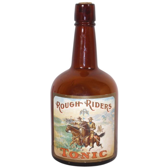 Political items (6), all Theodore Roosevelt, Rough Riders Tonic amber cork top bottle w/colorful pap