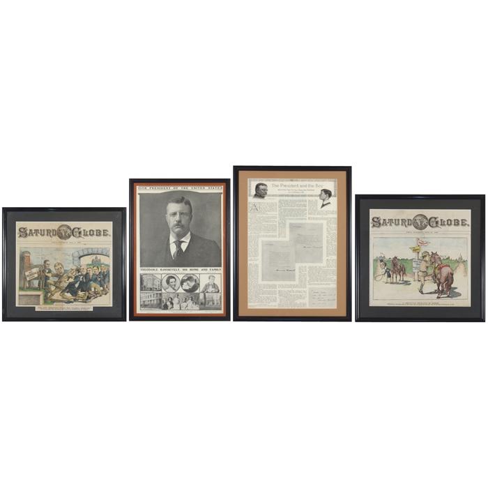 Political papers (4), Theodore Roosevelt Saturday Globe framed covers from 1900, The President and the Boy, c.1908 & 26th President of the United States picturing TR, his home & family, all prof framed & in Exc cond, largest is 17.5"H x 13"W.