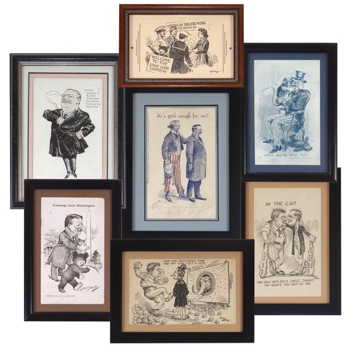 Political postcards (7), all Theodore Roosevelt-"He's good enough for me", "Greetings from Washington" by Berryman, "Soak Him, Ted-Every Time You Hit Him I Get A Vote", "American Theatre Wing", "Do The G.O.P.", "Teddy-Originator of Big Stick, Teddy Bears, Race Suicide, etc." & Uncle Sam's New Toy", prof framed early 1900's cards, VG cond., up to 8"H x 6"W.