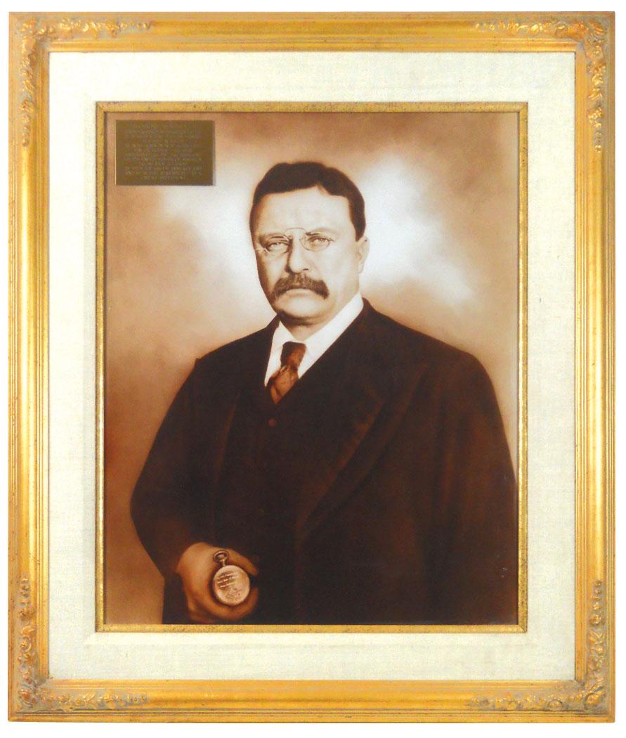 Political print of Pres. Theodore Roosevelt, a contemporary sepia-tone print of the original 1911 version showing Teddy w/his famous pocket watch, in thick gold wood frame w/brass information plate, VG cond, 33"H x 29"W.