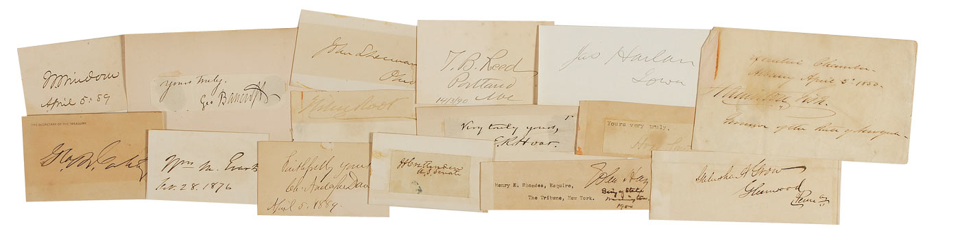 Ink signatures of 15 politicians on various size cards and slips. Signers are: Elihu Root, John Sherman, George Cortelyou, John Hay, John J. Crittenden, George Bancroft, William Evarts, Hamilton Fish, Charles Anderson Dana, Galusha Grow, E. R. Hoar, Thomas B. Reed, Hoke Smith, William Windom, and James Harlan. In overall good condition, with some toning and fading on some signatures.