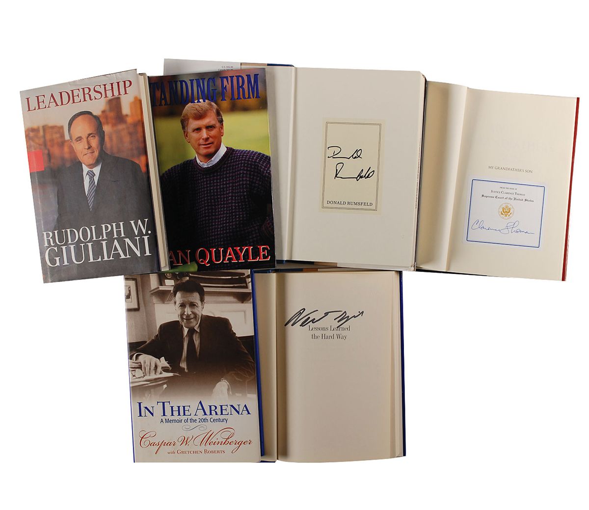 Six hardcover books, each signed inside on the title page, half-title page, or a bookplate affixed to an opening page, by the respective author. Signers are: Newt Gingrich (Lessons Learned The Hard Way), Caspar Weinberger (In The Arena), Rudy Giuliani (Leadership), Dan Quayle (Standing Firm), Donald Rumsfeld (Known and Unknown), and Clarence Thomas (My Grandfather’s Son). In fine condition.