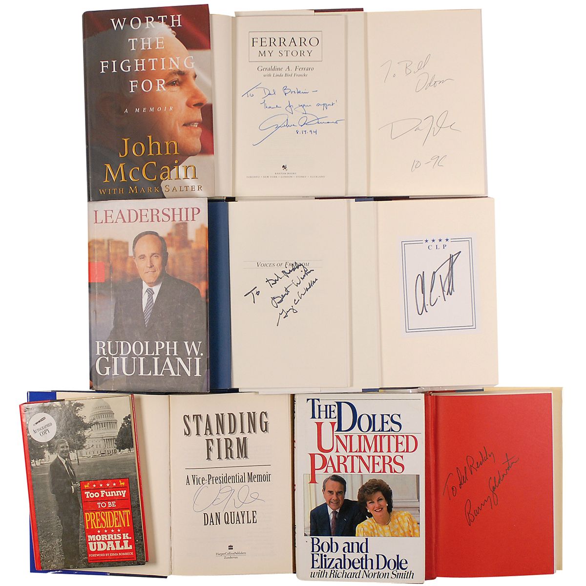 Ten hardcover books, each signed on an opening page (or affixed bookplate) by the respective politician. Signers are: Dan Quayle (Standing Firm and The American Family, both ins), John McCain (Worth Fighting For, ins), Bob Dole (Unlimited Partners, ins), Geraldine Ferraro (My Story, ins), Colin Powell (My American Journey), Rudy Giuliani (Leadership), Morris Udall (Too Funny To Be President, ins), Barry Goldwater (Goldwater, ins), George Wallace (Voices of Freedom, ins). In overall fine condition.