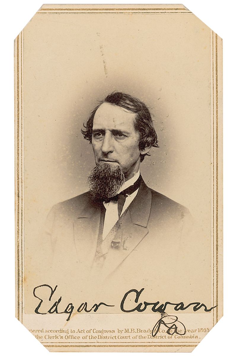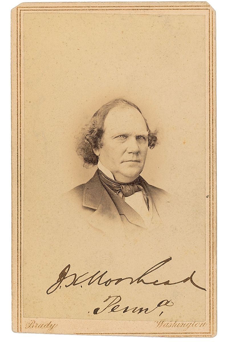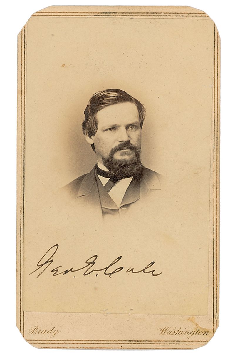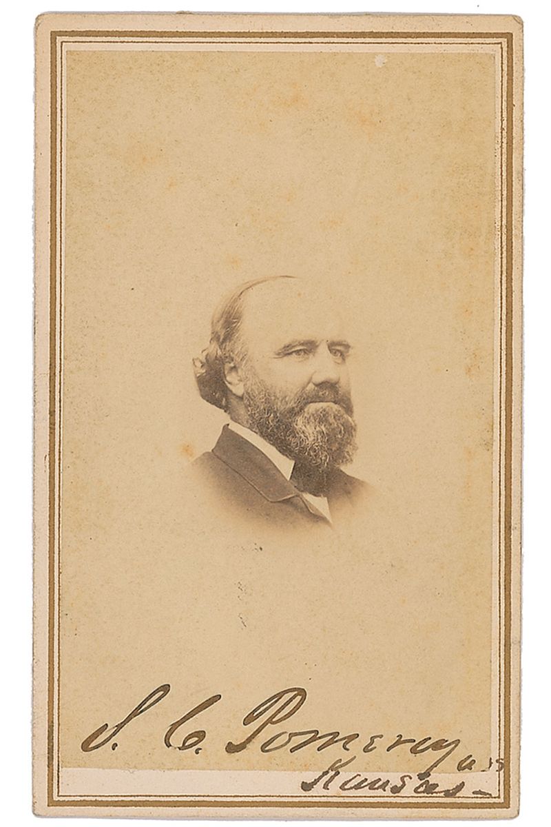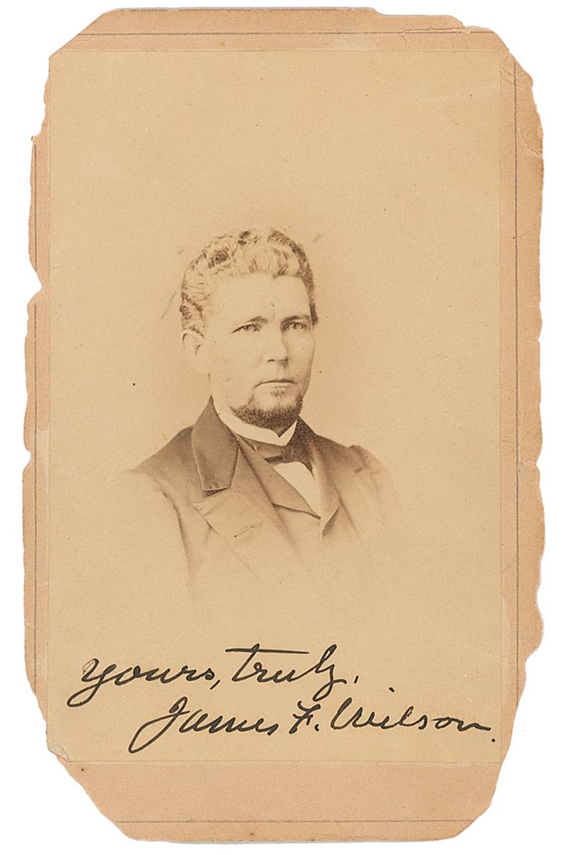 Excellent collection of twenty photographs, each signed by a notable American politician. Fourteen are cartes-de-visite, signed individually by the following: John A. Andrew, George S. Boutwell, Charles Rollin Buckalew, George E. Cole, Edgar Cowan, Garrett Davis, Solomon Foot, James Harlan, James Kennedy Moorhead, Marcus Mills Pomeroy (signed on reverse), Samuel Clarke Pomeroy, Edward Henry Rollins, Thomas Williams, and James Falconer Wilson. The remaining six are impressive cabinet photos, signed by: Thomas Ewing, Walter Q. Gresham, Judson Harmon, Hilary A. Herbert, Daniel S. Lamont, and William L. Wilson. In overall very good condition, with clipped corners and chipping along edges of many.