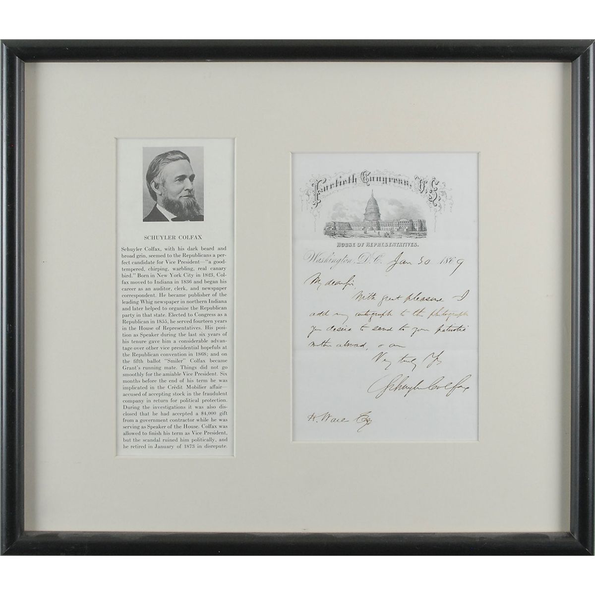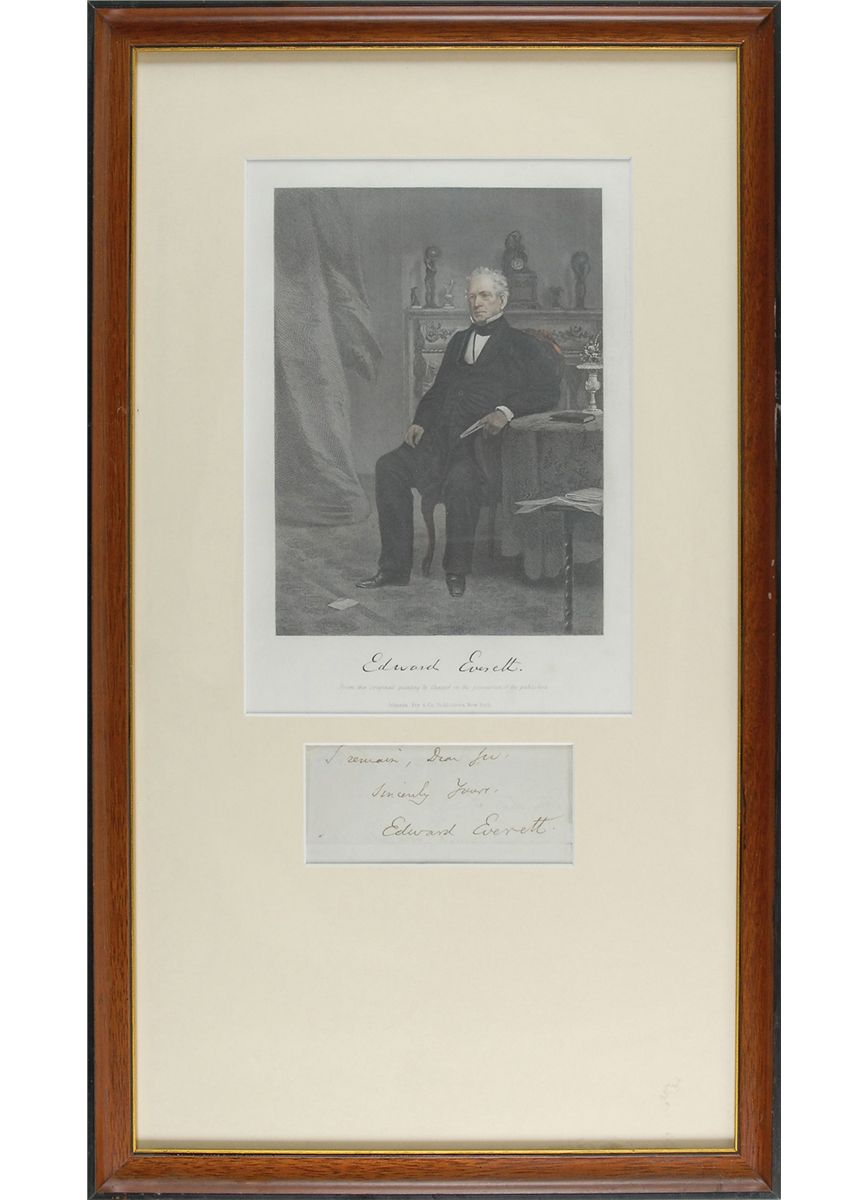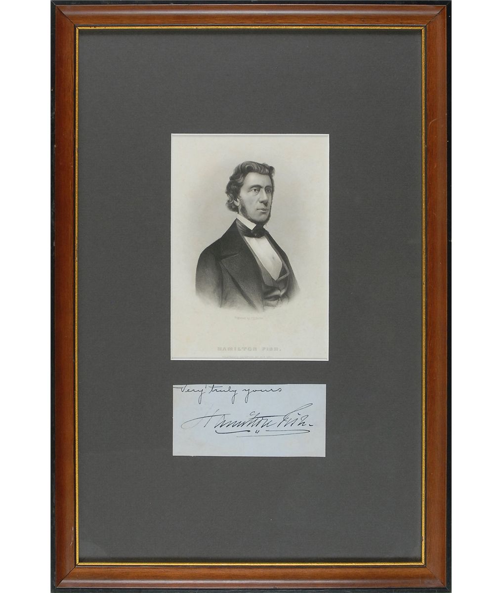 Collection of six items, each signed by a notable early American politician, including: Schuyler Colfax (ALS), John Sherman (signature), Edward Everett (signature), Hugh McCulloch (signature), Hamilton Fish (signature), and DeWitt Clinton (DS). Each piece is matted and framed with a portrait of the signer to an overall size of approximately 12 x 20. In overall fine condition.