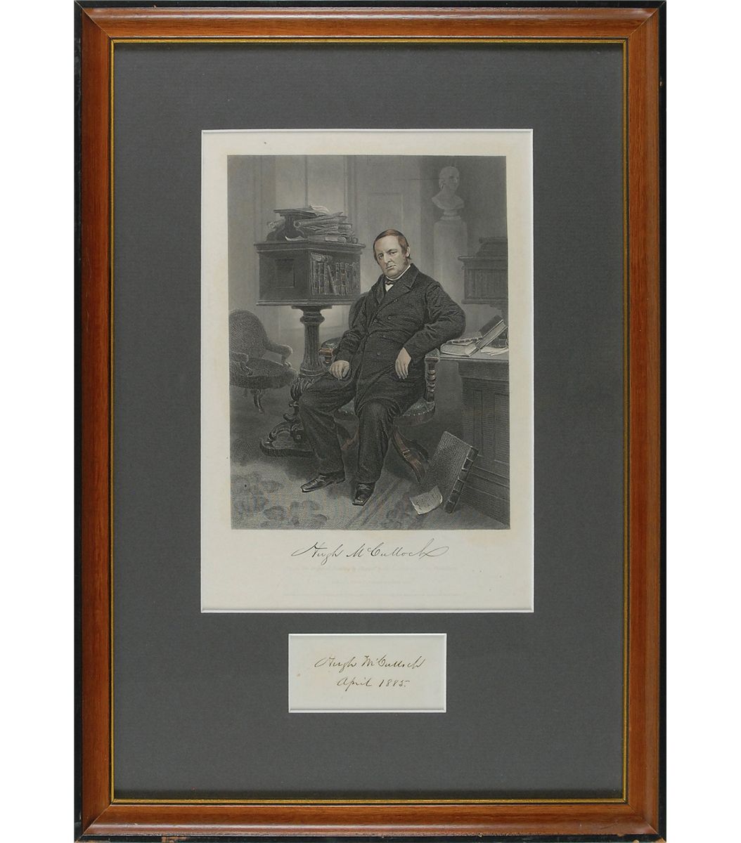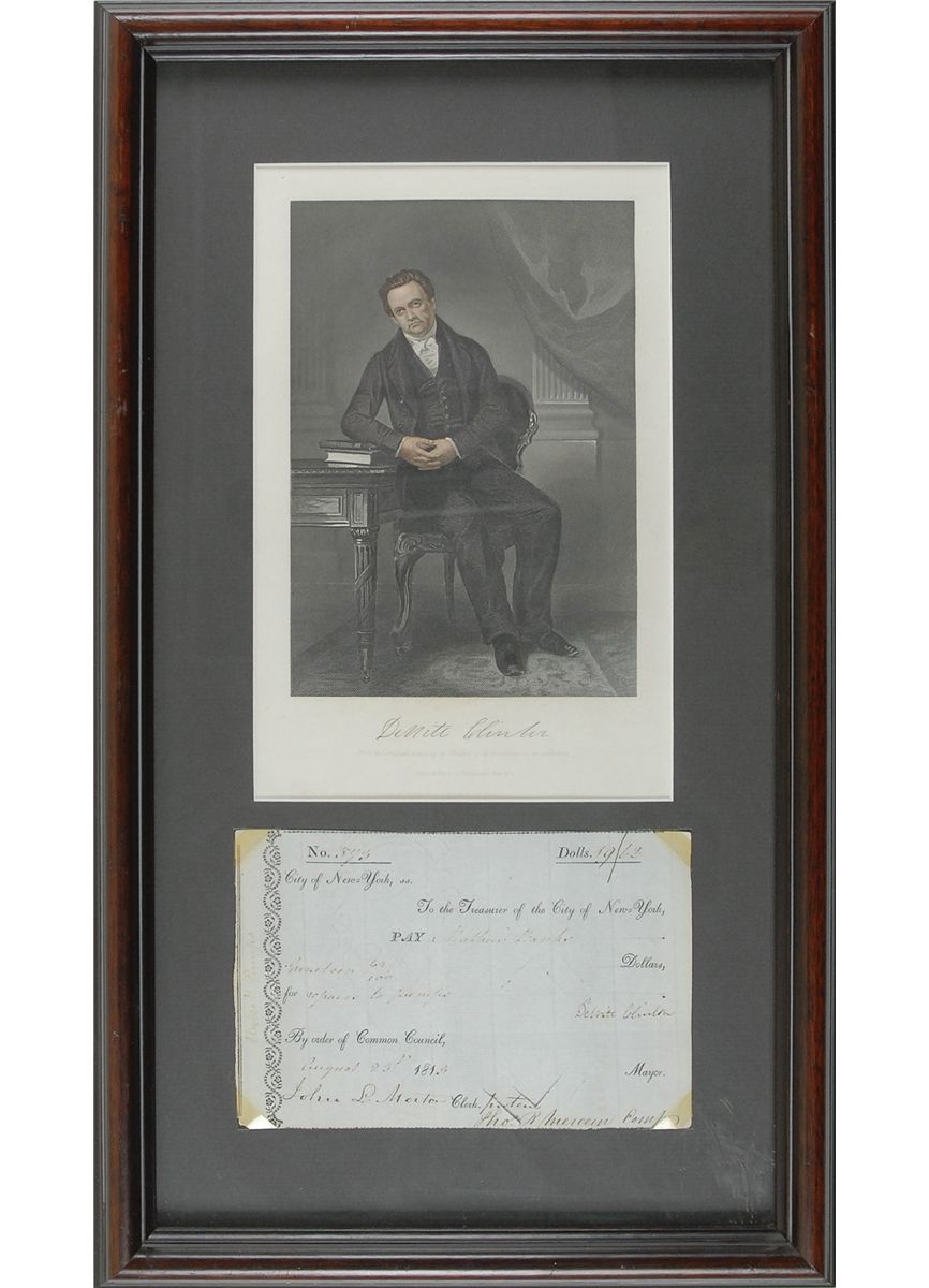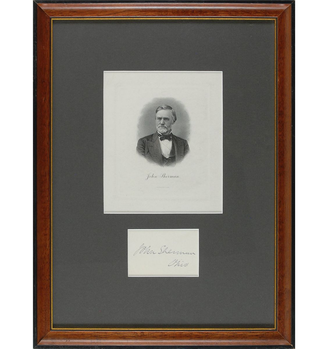 Collection of six items, each signed by a notable early American politician, including: Schuyler Colfax (ALS), John Sherman (signature), Edward Everett (signature), Hugh McCulloch (signature), Hamilton Fish (signature), and DeWitt Clinton (DS). Each piece is matted and framed with a portrait of the signer to an overall size of approximately 12 x 20. In overall fine condition.