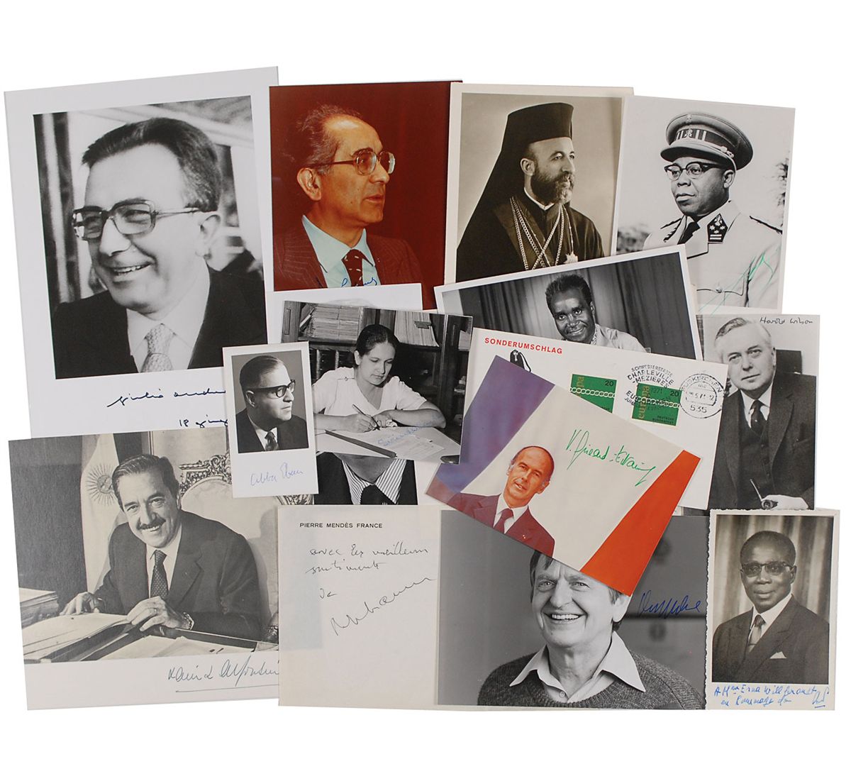 Collection of 17 items, various formats, each signed by a prominent world leader, including: Raul Alfonsin (SP), Giulio Andreotti (SP), Sirimavo Bandaranaike (SP), James Callaghan (signature), Emilio Colombo (SP), Alec Douglas-Home (SP), Abba Eban (SP), Valery Giscard d'Estaing (SP), Edward Heath (SP), Joseph Kasa-Vubu (SP), Kenneth Kaunda (SP), Urho Kekkonen (cover), Makarios III (SP), Pierre Mendes France (signature), Olof Palme (SP), Leopold Sedar Senghor (SP), and Harold Wilson (SP). In overall fine condition.