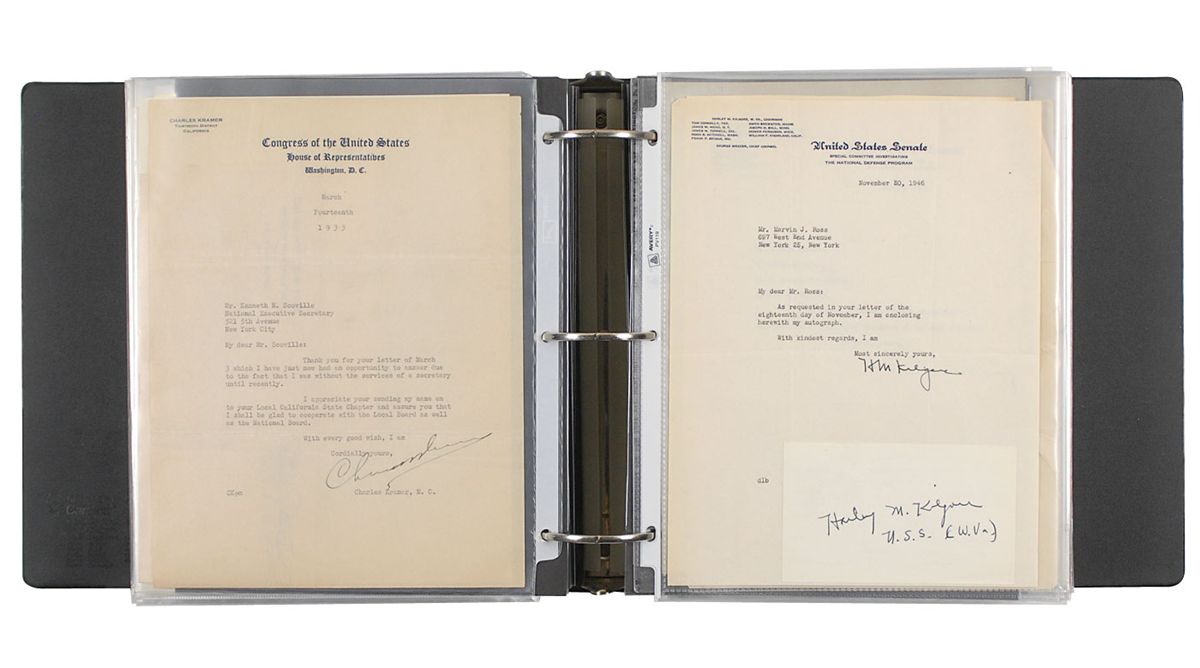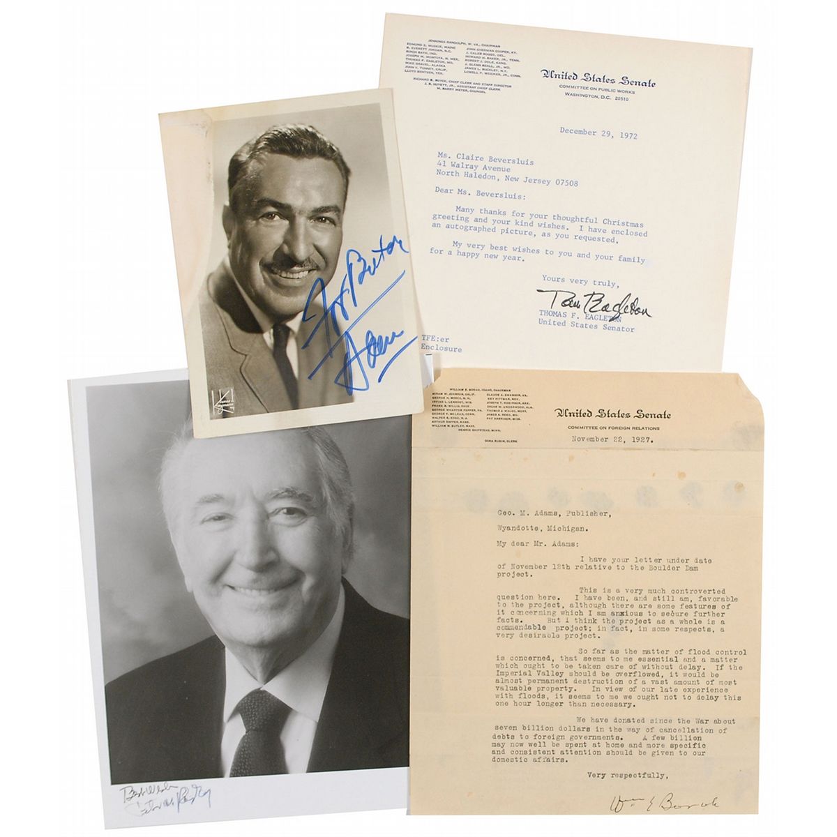Collection of over 125 items comprised of signed photos, letters, cards, and programs, each signed by politician, including: Carl Albert, John Dingell, Tom Eagleton, James Eastland, William Fulbright, Phil Gramm, Tom Harkin, Jesse Helms, Jacob Javits, Ed Koch, Mike Mansfiero, Eugene McCarthy, John McCormick, Wilber Mills, Tip O’Neill, Claude Pepper, Adam Clayton Powell, Charles Rangel, Peter Rodino, William Borah, and Shirley Chisholm. In overall very good to fine condition. The volume of items precludes a complete list, and interested parties are advised to view the collection in person at our offices, as this collection is sold as is, and no returns will be accepted.