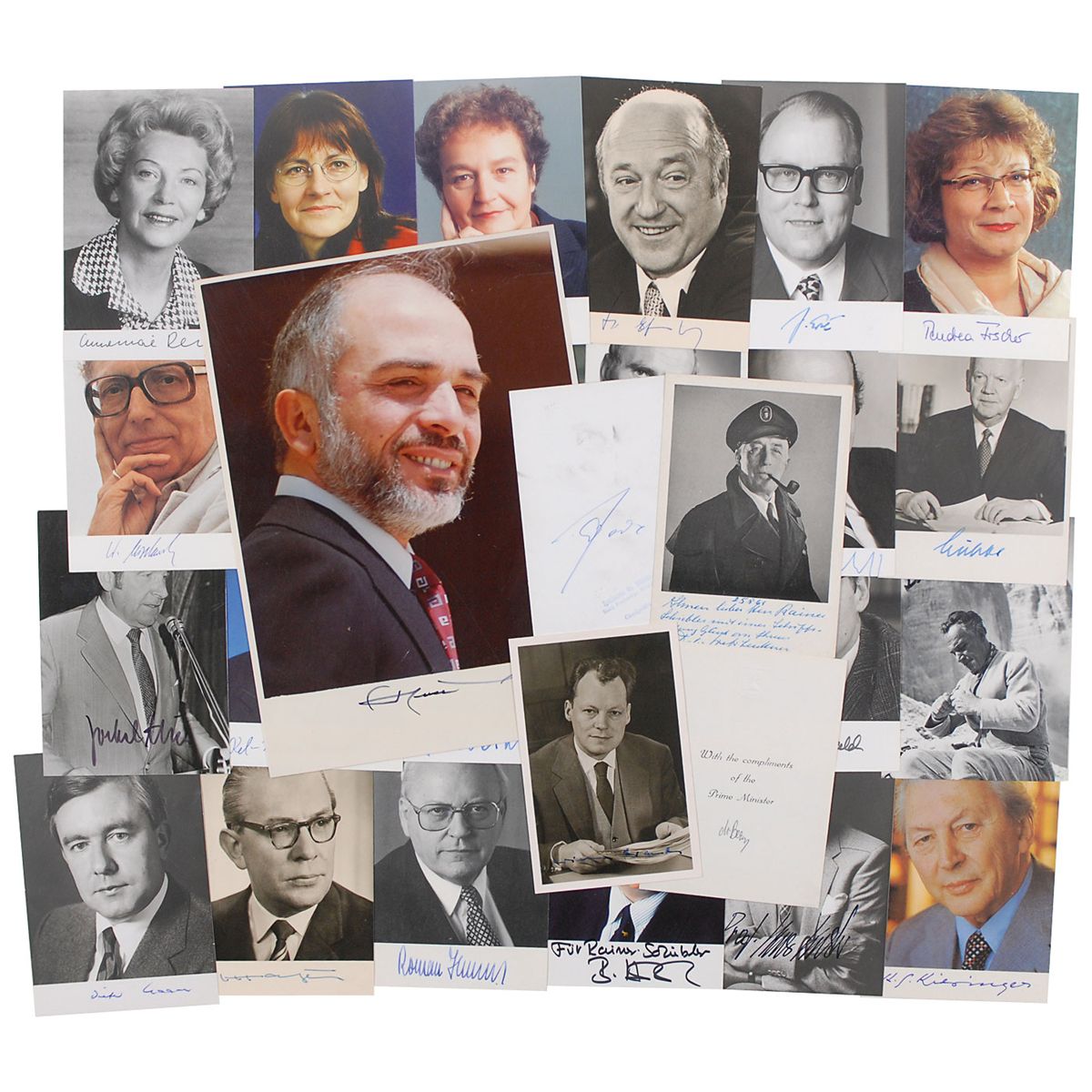 Collection of 55 items of various formats, the vast majority being photos of about 4 x 6, each signed by a world politician, including: Menachem Begin, King Hussein of Jordan, Felix Graf von Luckner, Lech Walesa, Willy Brandt, Alfons Goppel, Kai-Uwe von Hassel, Kurt Georg Kiesinger, Heinrich Lubke, Albert Osswald, Franz Josef Strauss, Richard Stucklen, Herbert Wehner, Helmut Kohl, Gaston Thorn, and 40 others. In overall fine condition. Many are accompanied by original mailing envelopes and transmittal letters.