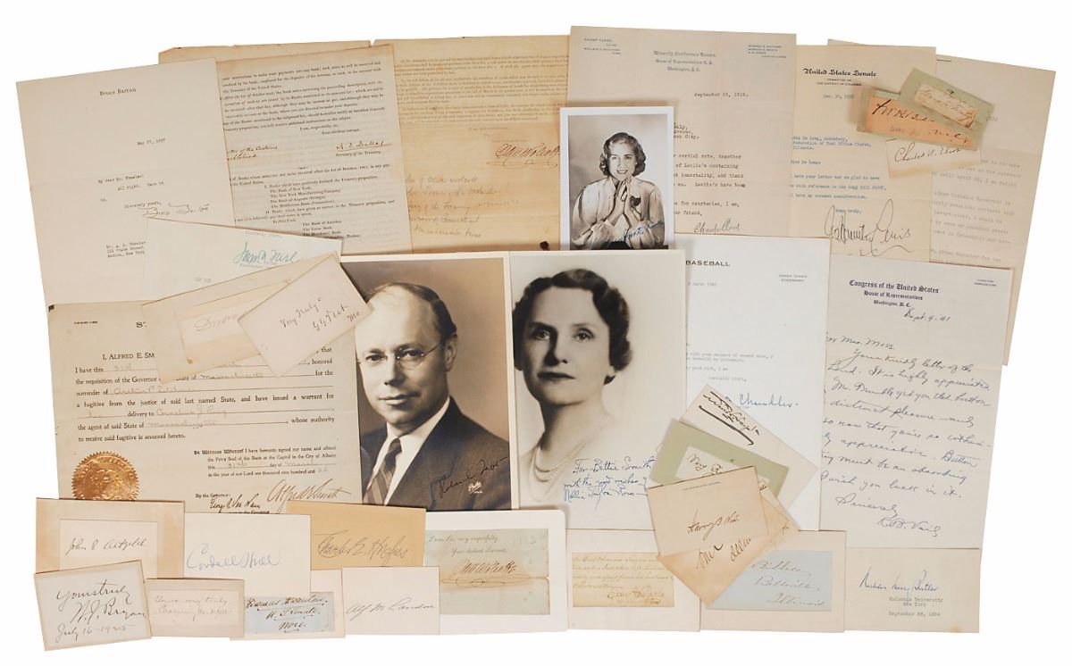 Collection of 34 items, consisting of letters, signatures, photos, and documents signed by American politicians, including: Daniel Webster; Edmund Randolph; William Jennings Bryan; Alexander J. Dallas; Thomas Hart Benton; Charles Evans Hughes; Oliver Wolcott, Jr. (2); Edward Shippen IV; Clare Boothe Luce; George Graham Vest; Alfred E. Smith; Alf Landon; Cordell Hull; Shelby Cullom; Uriah Tracy; Nellie Tayloe Ross; A. B. ‘Happy’ Chandler; Champ Clark; Harry Stewart New; Chauncey Depew; Robert A. Taft; John Peter Altgeld; J. Hamilton Lewis; William Henry Bissell (2); Bruce Barton; Richard Yates; James A. Farley; Will H. Hays; Charles W. Eliot; Nicholas Murray Butler (2); and Bob Vail. Also includes two covers signed by British politicians: F. J. Robinson, Earl of Ripon; and George Robinson, Marquess of Ripon. In overall very good to fine condition.