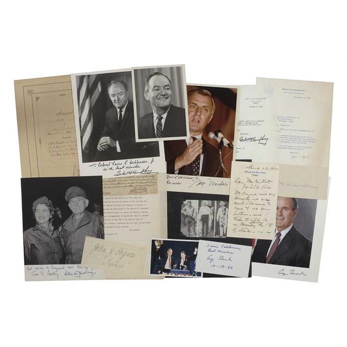 Collection of 12 items, consisting of letters, signatures, and signed photos from politicians. Signers are: George Bush (2), Walter Mondale, Hubert H. Humphrey (2), H. A. Wallace, Spiro Agnew, John J. Ingalls, Thomas Maynard, Alben Barkley, Benjamin Wade, and George Clinton. Also included are three Lyndon B. Johnson items signed secretarially, and a Nelson Rockefeller photo signed in autopen. In very good condition. RRAuction COA.