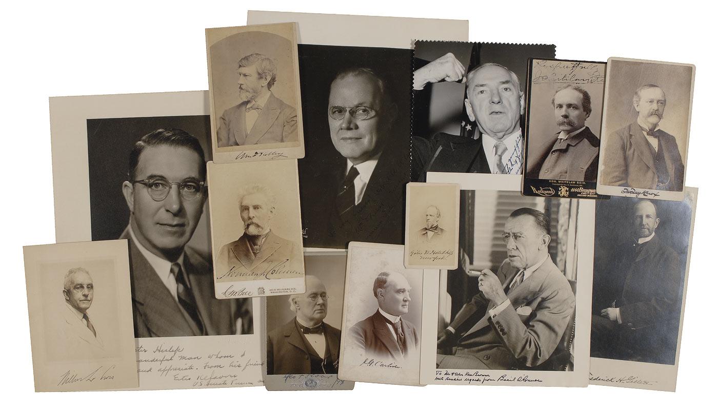 Thirteen vintage cabinet and matte-finish photos, ranging in size from 2.5 x 4 up to 11 x 14, each signed in ink by the respective politician pictured. Signers are: Giles Hitchkiss (cdv), Frederick Gillett, Wilbur Cross, George F. Hoar, John G. Carlisle, Norman J. Colman, William D. Kelly, John J. Chase, Whitelaw Reid, James Michael Curley (ins), Basil O’Connor (ins), William Green (ins), and Estes Kefauver. In very good condition, with skipping and contrast to several signatures, as well as scattered surface marks and creases. Provenance: The Barry Hoffman Collection.