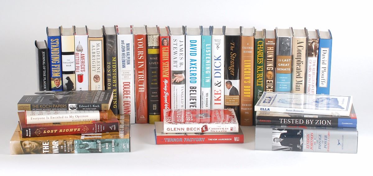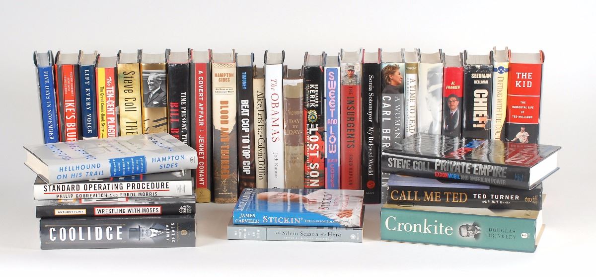 Complete list of authors and titles: Elliott Abrams (Tested by Zion); Trevor Aaronson (The Terror Factory); Madeleine Albright (Prague Winter); David Axelrod (Believer); Neal Bascomb (Hunting Eichmann); Glenn Beck (The Christmas Sweater); Dan Baum (Nine Lives); Carl Bernstein (A Woman in Charge); A. Scott Berg (Wilson); Ben Bradlee, Jr. (The Kid); Bill Bradley (Time Present, Time Past); Steven Brill (America’s Bitter Pill); Douglas Brinkley (Cronkite); David Brinkley (Everyone is Entitled to My Opinion); Ken Burns (The War); Susan Bysiewicz (Ella: A Biography of Governor Ella Grasso); Robert Caro (The Passage of Power); James Carvile (Stickin’: The Case for Loyalty); Jose Chapiro (Channing Day by Day); Wesley Clark (Waging Modern War); Wesley Clark (A Time to Lead); Rich Cohen (Sweet and Low); Steve Coll (Private Empire); Steve Coll (The Bin Ladens); Jennet Conant (A Covert Affair); Lloyd Constantine (Journal of the Plague Year); David Crist (The Twilight War); Anthony Flint (Wrestling With Moses); Richard Wightman Fox (Lincoln’s Body); Jeffrey Frank (Ike and Dick); Al Franken (Lies, And the Lying Liars Who Tell Them); Philip Gourevitch and Errol Morris (Standard Operating Procedure); Lani Guinier (Lift Every Voice); David Hajdu (The Ten-Cent Plague); Mark Halperin and John Heilemann (Double Down); Clint Hill (Five Days in November); Jeff Himmelman (Yours in Truth); Tony Horwitz (Midnight Rising); David Howard (Lost Rights); Jodi Kantor (The Obamas); Fred Kaplan (The Insurgents); Caroline Kennedy (Listening In); Bernard Kerik (The Lost Son); Ed Koch (The Koch Papers); Charles Kurault (A Life on the Road); David Plouffe (The Audacity to Win); Dan Quayle (Standing Firm); Sarah, The Duchess of York (Dieting With the Duchess); Albert Seedman (Chief!); Ira Shapiro (The Last Great Senate); Amity Shlaes (Coolidge); Hampton Sides (Hellhound on His Trail); Hampton Sides (Blood and Thunder); Sonia Sotomayor (My Beloved World); Gloria Steinem (Moving Beyond Words); James B. Stewart (Tangled Webs); Michael Takiff (A Complicated Man); Gay Talese (The Silent Season of a Hero); Jeanne Theoharis (The Rebellious Life of Mrs. Rosa Parks); Evan Thomas (Ike’s Bluff); John Timoney (Beat Cop to Top Cop); Chuck Todd (The Stranger); Calvin Trillin (Alice, Let’s Eat); and Ted Turner (Call Me Ted).