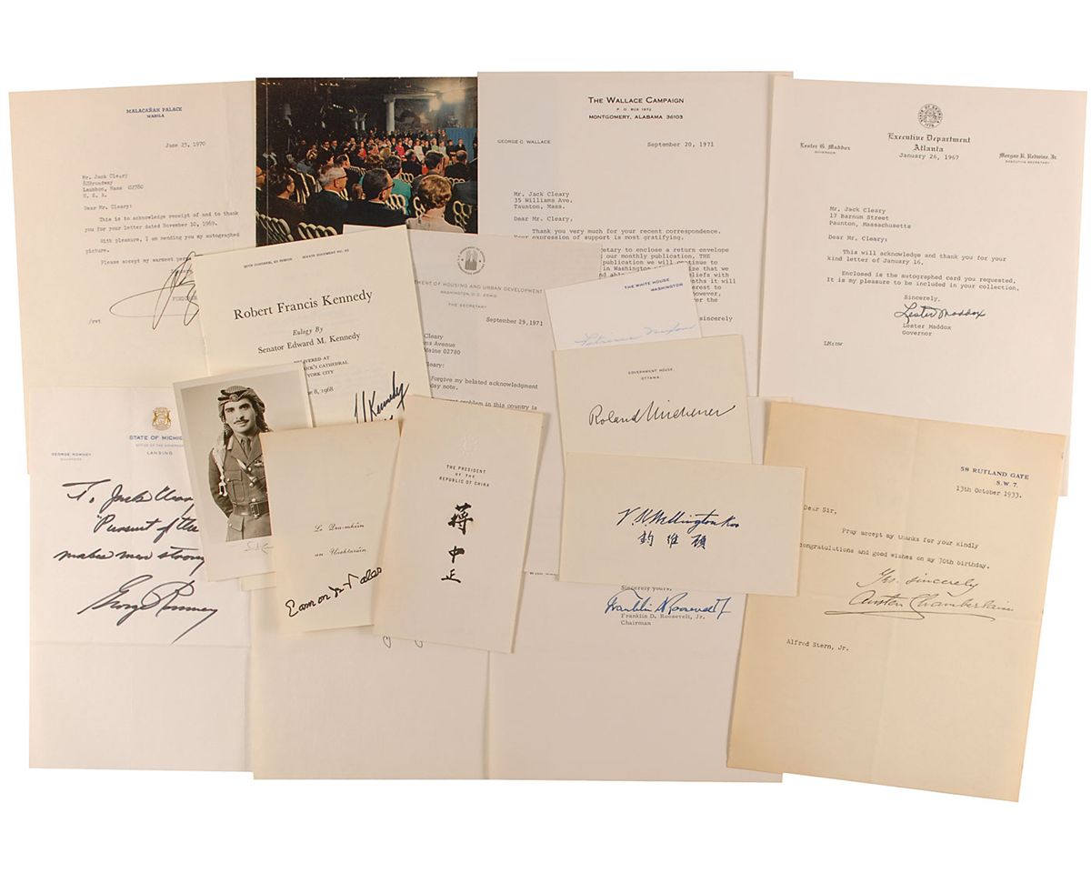 Sixteen items consisting of letters, signatures, pamphlets, and photos, each signed by a political or world leader. Signers include: Chiang Kai-Shek, Patricia Nixon, George Romney (2), J. Edgar Hoover, King Hussein of Jordan, Franklin D. Roosevelt, Jr., Austen Chamberlain, Ted Kennedy, Lester Maddox, Ferdinand Marcos, V. K. Wellington Koo, Roland Michener, Eamon de Valera, and George Wallace. Magazine photo is of Nixon’s cabinet and signed by Clifford M. Hardin, Melvin R. Laird, David M. Kennedy, John N. Mitchell, Maurice Stans, George P. Shultz, George Romney, William P. Rogers, Robert Finch, Walter Joseph Hickel, and Winton M. Blount. In overall fine condition, with various folds and light creases.