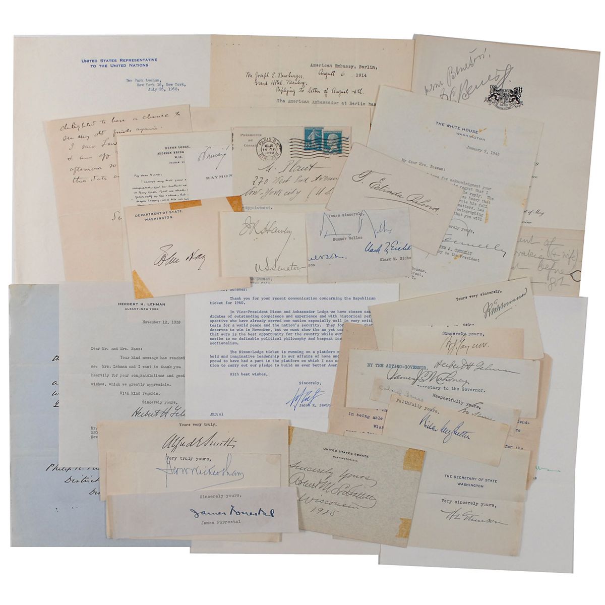 Collection of 28 items consisting of signatures and letters, each signed by a former politician or diplomat. Signers are: Edvard Benes, Nicholas Butler, Bainbridge Colby, Matthew Connelly, Caleb Cushing, James Forrestal, William Jay Gaynor, James W. Gerard (2), Joseph R. Hawley, John Milton Hay, Edward House, Jacob Javits, William Knowland, Robert LaFollette, Harold Laski, Herbert Lehman (2), Henry Cabot Lodge, Estrada Palma (2), Raymond Poincare, Al Smith, Henry L. Stimson, Richard von Kuhlman, Sumner Welles, George Wickersham, and G. Mennen Williams. In overall very good condition.